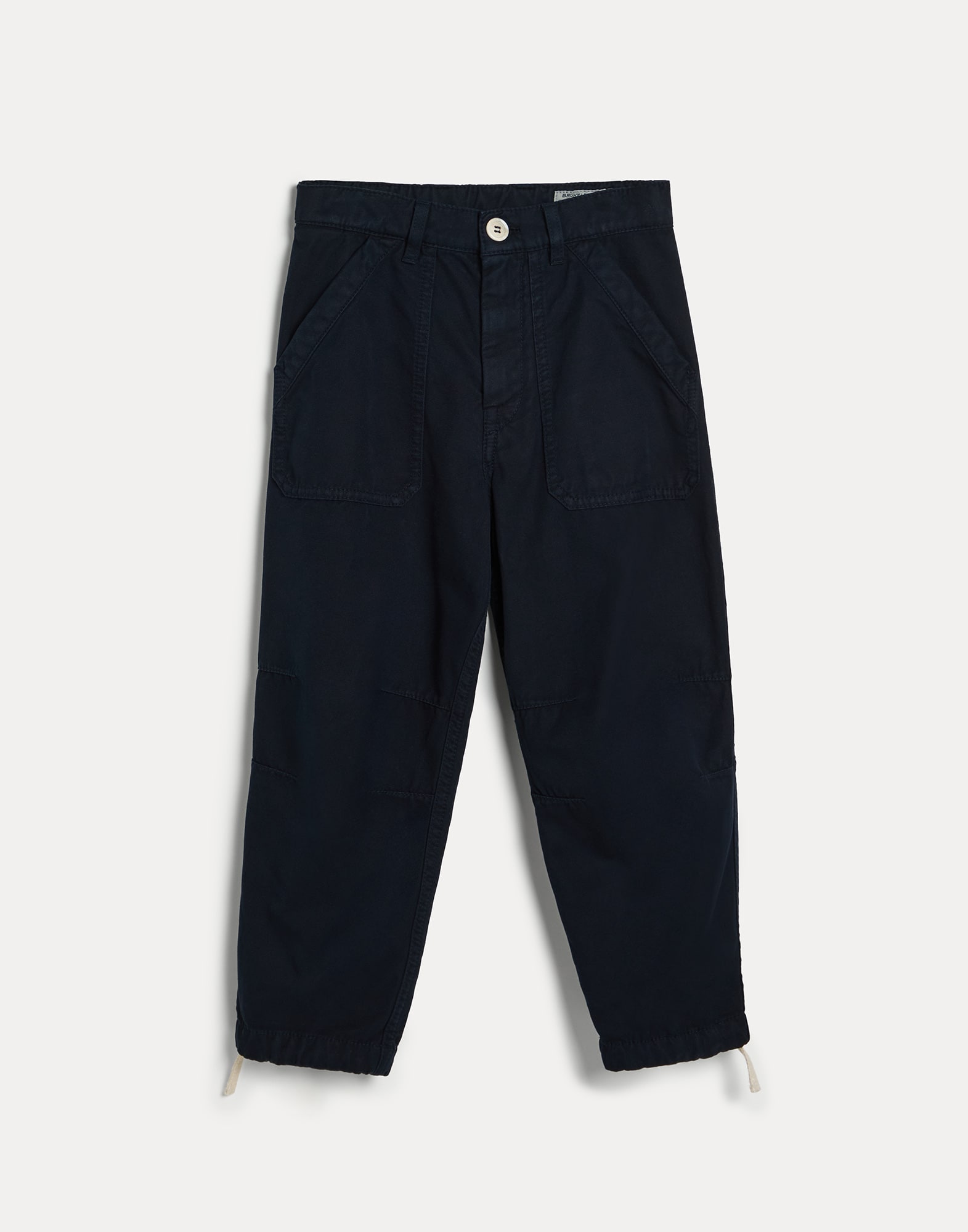 Die moderne Optik des Gabardine aus stückgefärbtem Baumwollzwirn unterstreicht den Utility-Stil der Hose mit großen Vordertaschen und einer modernen Passform, die locker und fließend herabfällt und am Bein von einem elastischen Saum zusammengefasst wird.