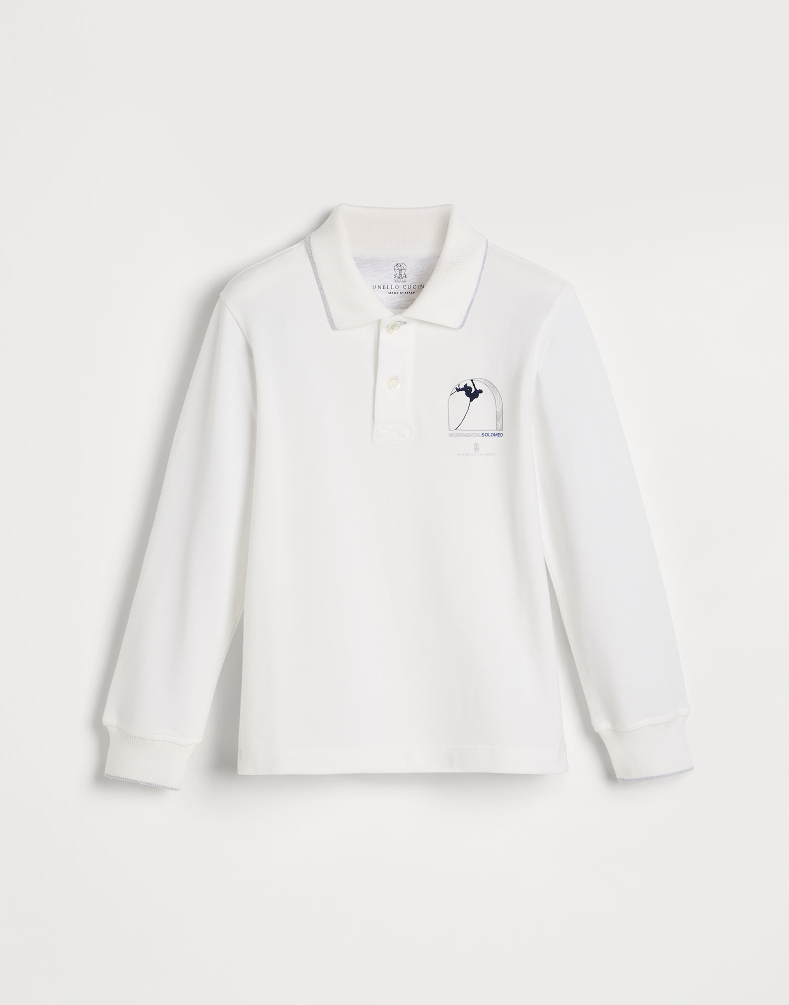 Der klassische Stil des langärmeligen Poloshirts wird am Kragen und an den Kanten mit einem kontrastierenden Farbton neu interpretiert, der für Dynamik sorgt und das Modell verziert. Der neue Saisonprint auf der Brust vervollständigt das Design und lädt die Kleinen zur Freude an Entdeckungen ein.