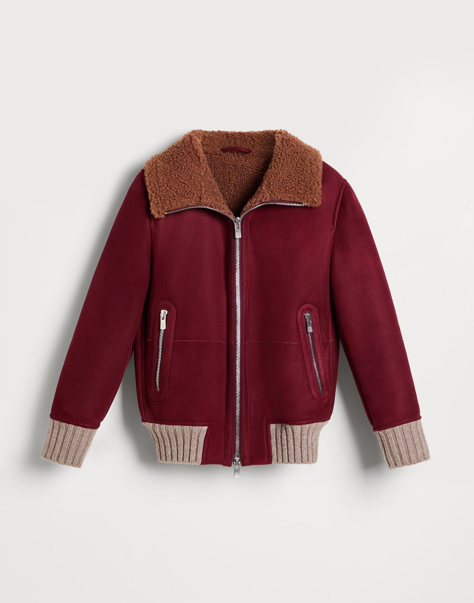 The excellence of Brunello Cucinelli leathers and a sporty feel define the style of this suede shearling bomber jacket. Special workmanship gives the exterior a sueded appearance, while the interior maintains the characteristic full, cozy appearance of shearling. The rib knit inserts on the collar, cuffs and bottom band complete the garment with a sophisticated texture contrast.