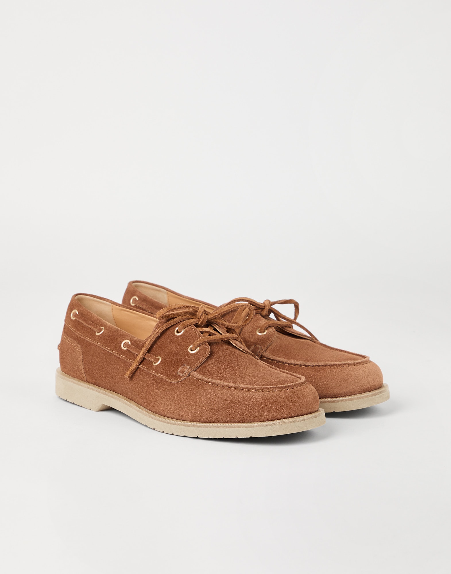 Nautical inspiration takes shape in these tapered moccasins, inspired by traditional boating footwear. The casual, sporty spirit of boat shoes enhances the characteristic irregularity of the smooth, velvety washed suede. The construction incorporates some elements of a Derby, for more stable support on the ultra-lightweight outsole.