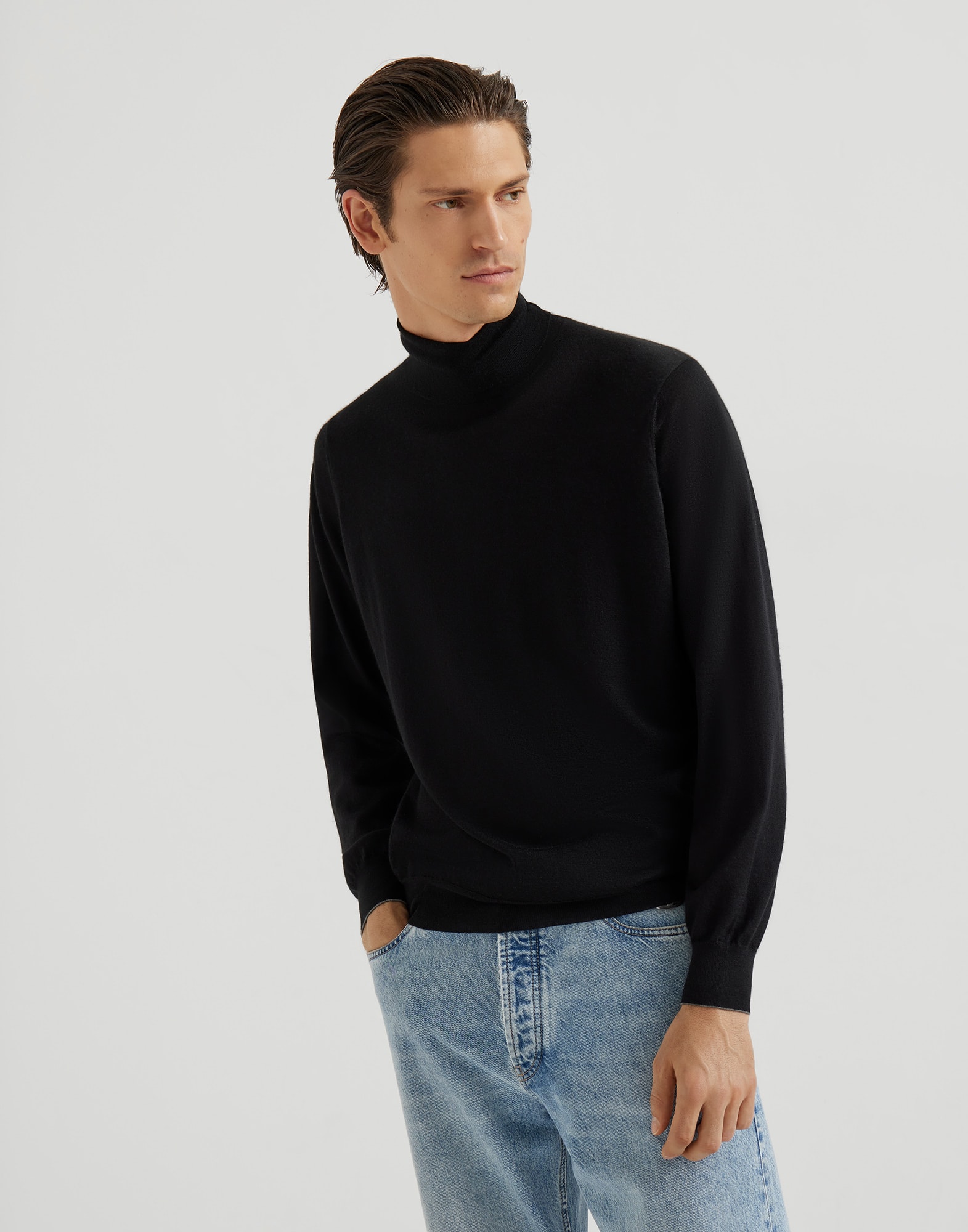 The excellence of Brunello Cucinelli yarns enhances the essential lines of this long sleeve turtleneck sweater, a must-have menswear piece. The lightweight knitted garment blends cashmere and silk fibers in a single yarn, enriching the season's colors with a soft, warm and cozy texture. The fit features regular, comfortable proportions.