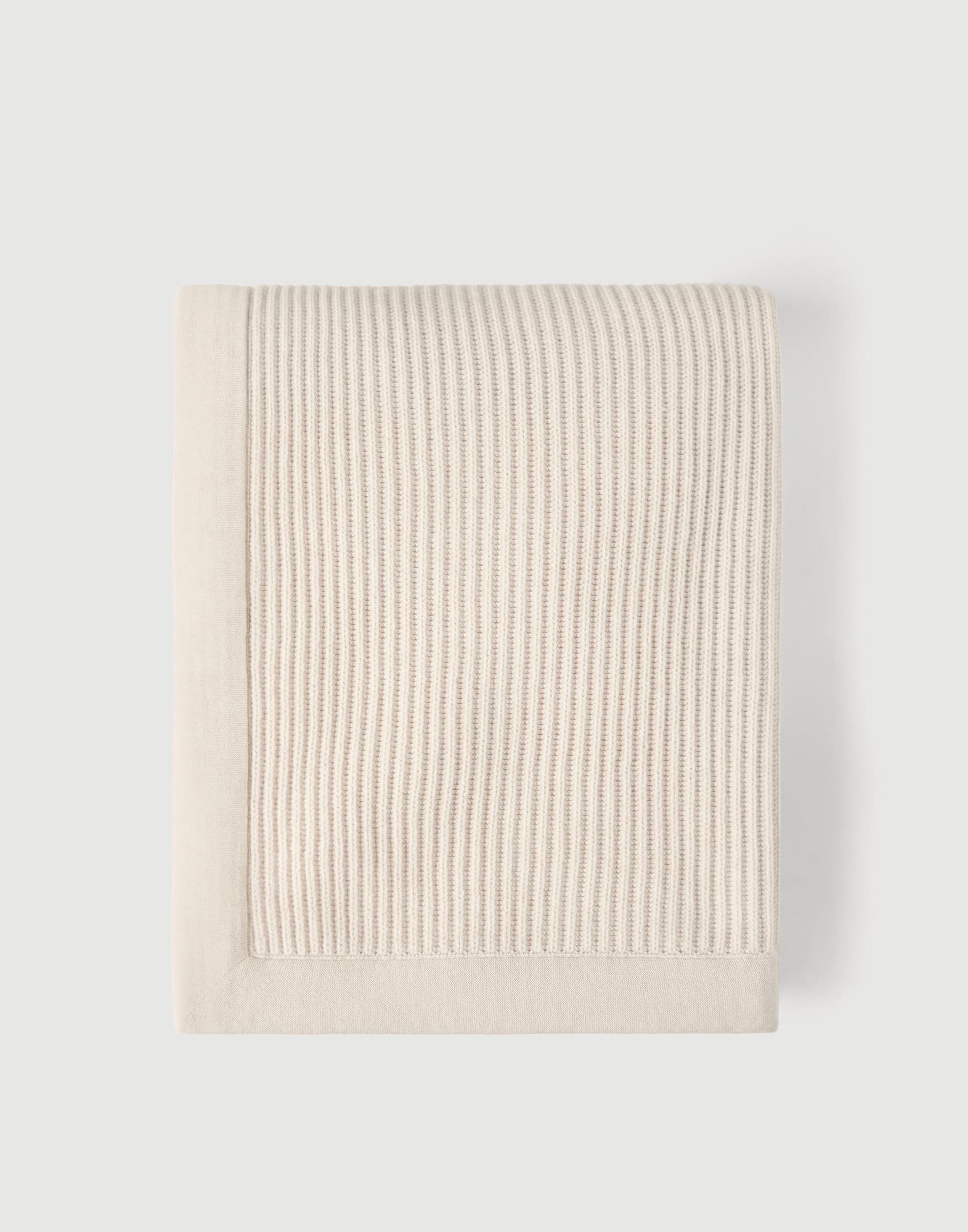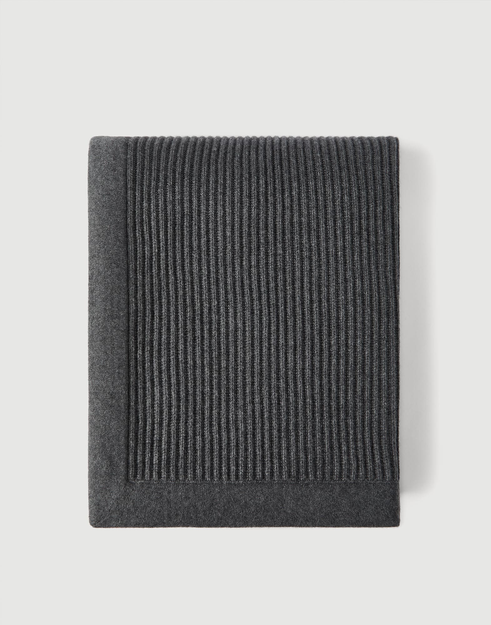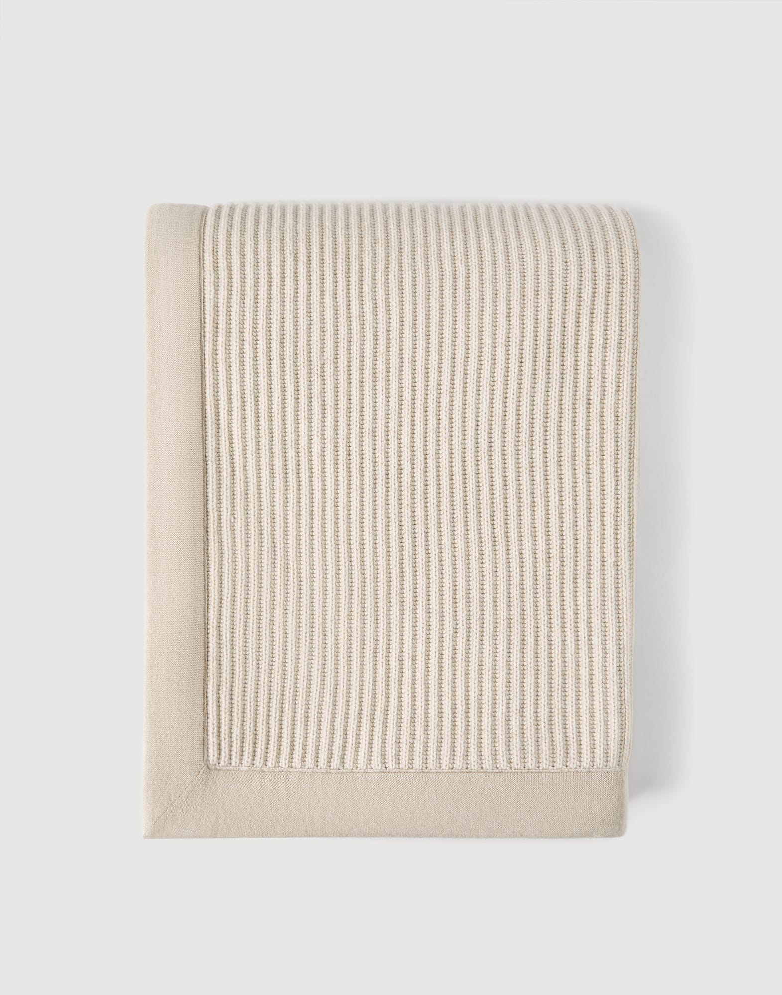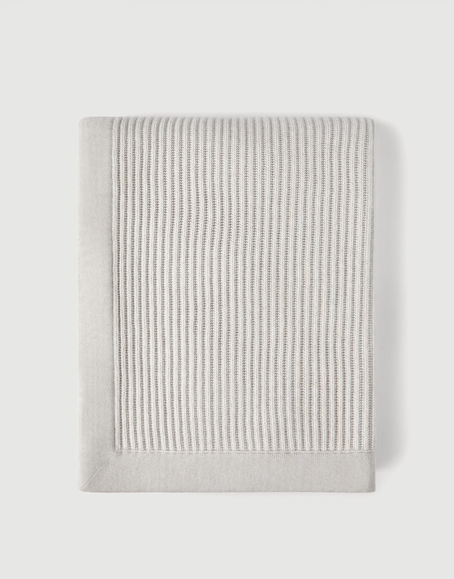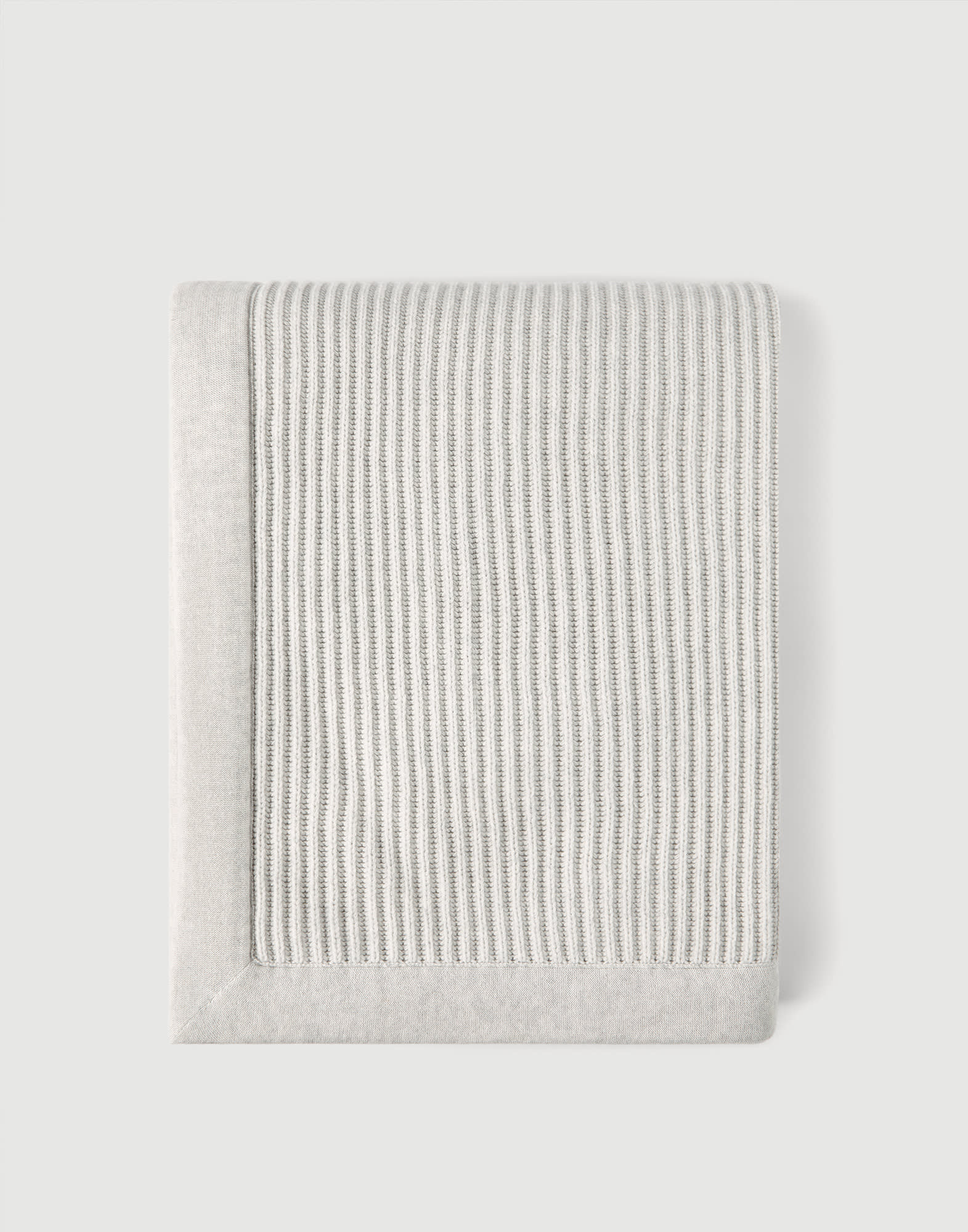 This throw is enriched with pure cashmere yarn, which embodies the excellence of Brunello Cucinelli materials. Traditional English Rib is paired with smooth knit borders.