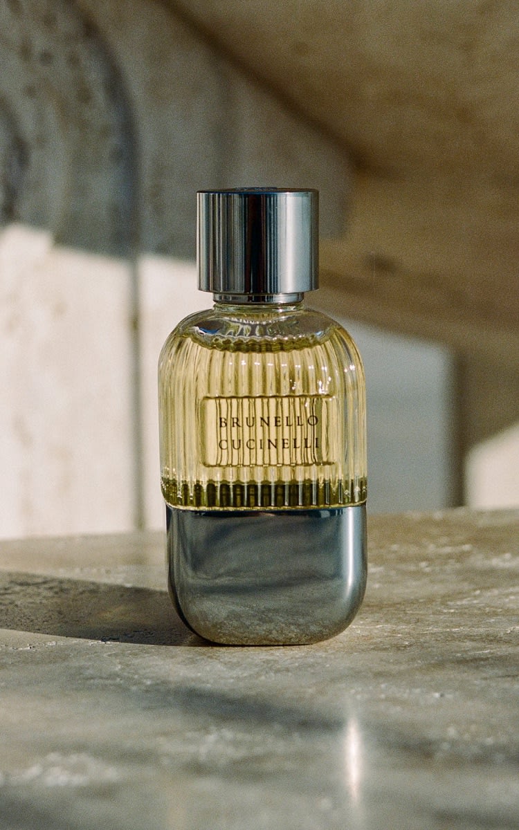Brunello Cucinelli fragrances are presented in packaging with a refined and contemporary design. The body of the bottle is made of subtly fluted glass, while the innovative mono-material cap and base are made of aluminum, creating a sophisticated contrast of materials and colors. On the cap, the iconic heraldic logo is embossed in high relief thanks to advanced technology, adding a personal touch to the bottle's design. Finally, the outer packaging is made of fully biodegradable FSC® certified paper and is protected on the outside by a transparent film that seals the entire package.