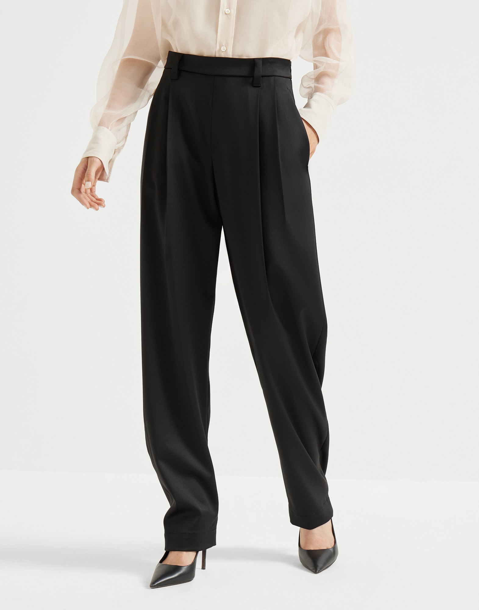 A relaxed attitude and tailored details define the style of these virgin wool stretch satin slouchy trousers. The fabric’s fluid texture complements the garment’s lines, which fall softly down the leg, tapering slightly at the ankle, creating a very subtle curve. Classic menswear elements such as the double pleats and rear welt pockets elevate the silhouette, while the iconic shiny monili embroidery completes the trousers with a feminine sparkle in true Brunello Cucinelli style.
