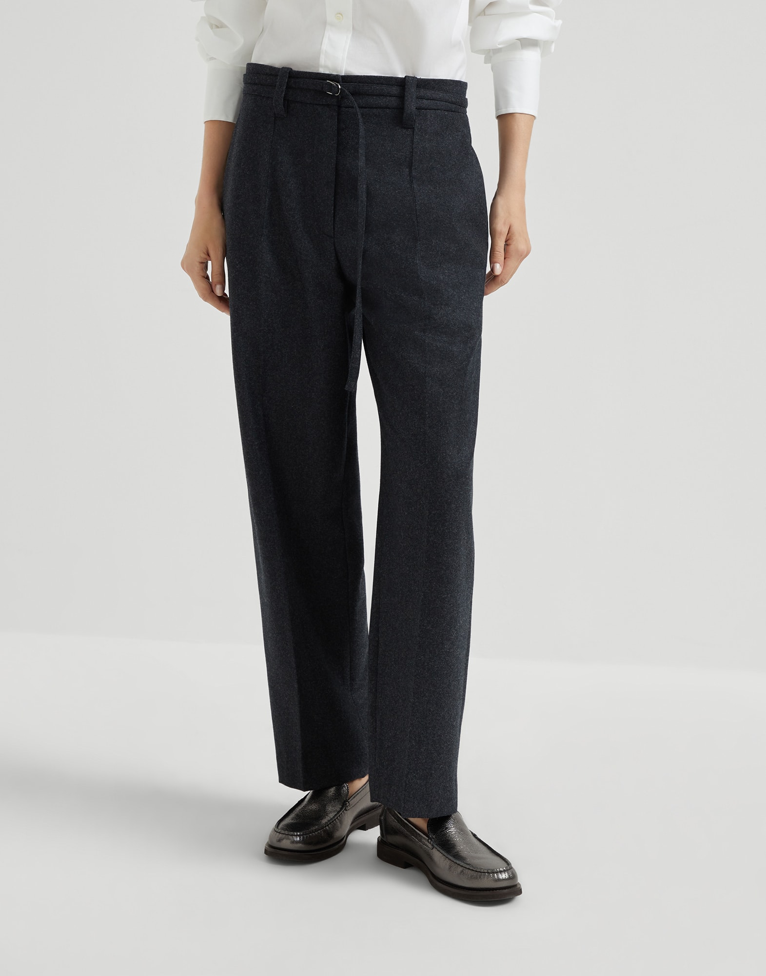 Sparkling details and casual proportions define the style of these new Straight Crop trousers. This piece features a soft, relaxed silhouette in the seat and a wide, straight leg cut characterized by a “cropped” design. The removable D-ring belt highlights the waist and adds a functional, sporty element that goes well with the precious shiny monili embroidery, the iconic embellishment of the Brunello Cucinelli collections.