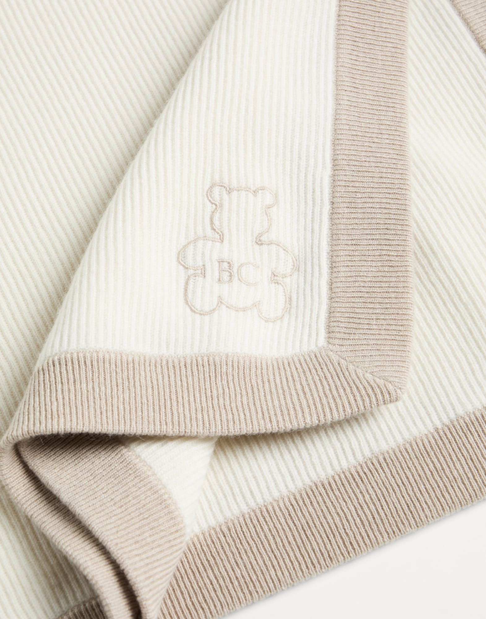 Bernie the iconic bear takes part in a child’s first months and early adventures, enriching the garments of the Newborn line, designed for infants 0 to 36 months. The ultra-soft texture of this Baby blanket showcases a contrast color border, while rib knitting enhances the accessory’s sense of warmth and fluidity, expressing a style that is casual yet elegant.