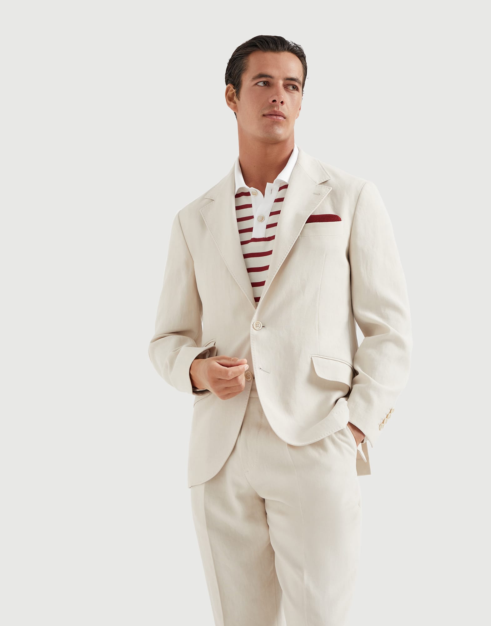 Iconic details and refined elegance define the contemporary spirit of this unconstructed Cavallo blazer with wider lapels and angled flap pockets. The slubbed characteristic of linen is enriched in body and structure thanks to a particular twisted thread technique. The “Solomeo Shoulder”, named after the hamlet where the company is located, characterizes the Brunello Cucinelli blazer with signature proportions. The tapered and pronounced cut of the shoulder enhances the male physique without the need for padding.