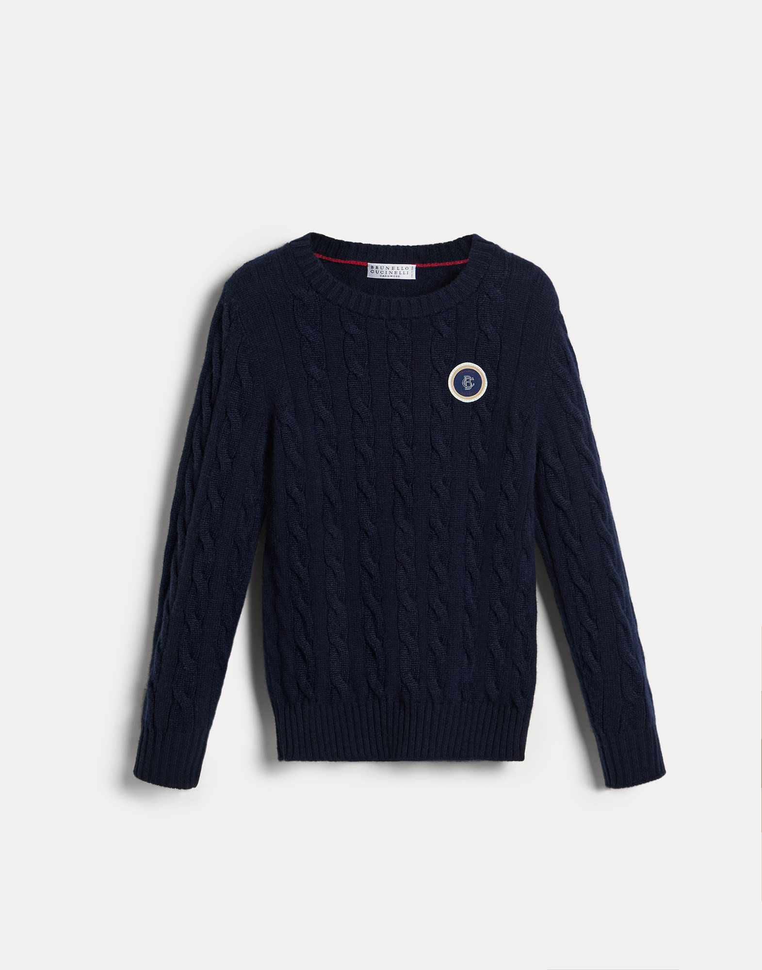 The attention to detail, the beauty of materials and the comfort that distinguishes Brunello Cucinelli style are clearly recognizable in the knitwear for boys. The classic, sporty feel of cable knitting defines the attitude of this pure cashmere crew-neck sweater. The “BC” patch embroidered on the chest completes the garment’s style with a lively touch. The refined yarn ensures softness, protection and warmth without compromising comfort.