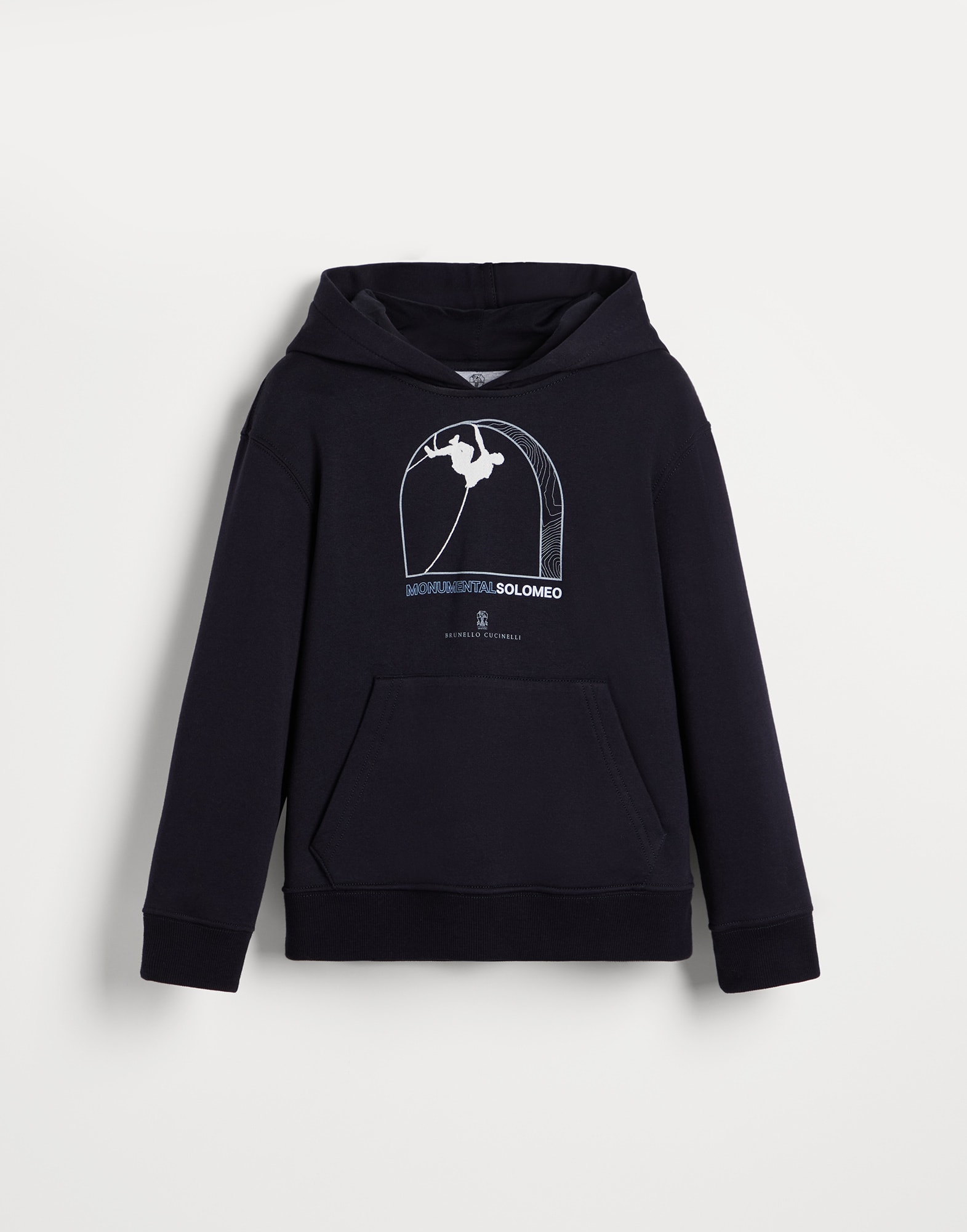 Designed for relaxing or playing, Brunello Cucinelli Travelwear delivers the soft and cozy sensations of precious fibers through its sporty garments for children. Made of lightweight techno cotton French terry, this hooded sweatshirt pairs the casual feel of the material with a print inspired by the world of hiking: an invitation for children to experience the joy of discovery.
