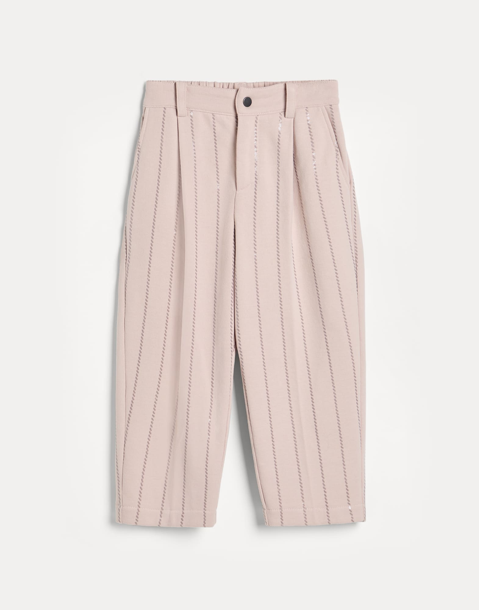 These Smooth cotton French terry Sartorial trousers express a refined balance between tailoring codes and a contemporary spirit. The soft, comfortable fabric introduces a casual element that creates an interesting contrast with the elegant feel of the pleats and the sartorial-inspired construction. The classic pinstripe pattern is reinterpreted with a modern twist thanks to a thin row of sequins, for a sparkling touch. The silhouette features an essential design, defined by relaxed volumes.