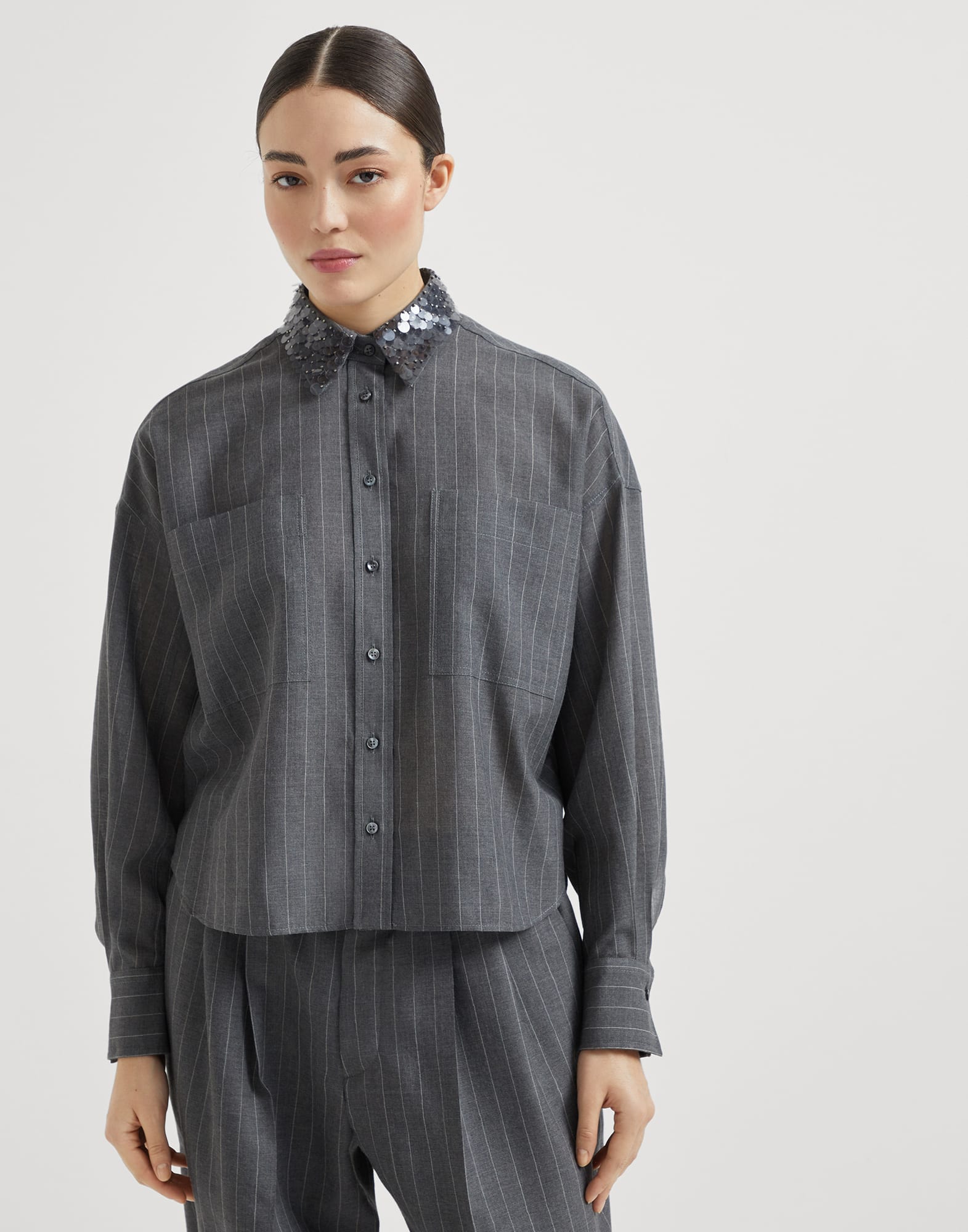 Virgin wool chalk stripe gauze shirt with swing drops collar