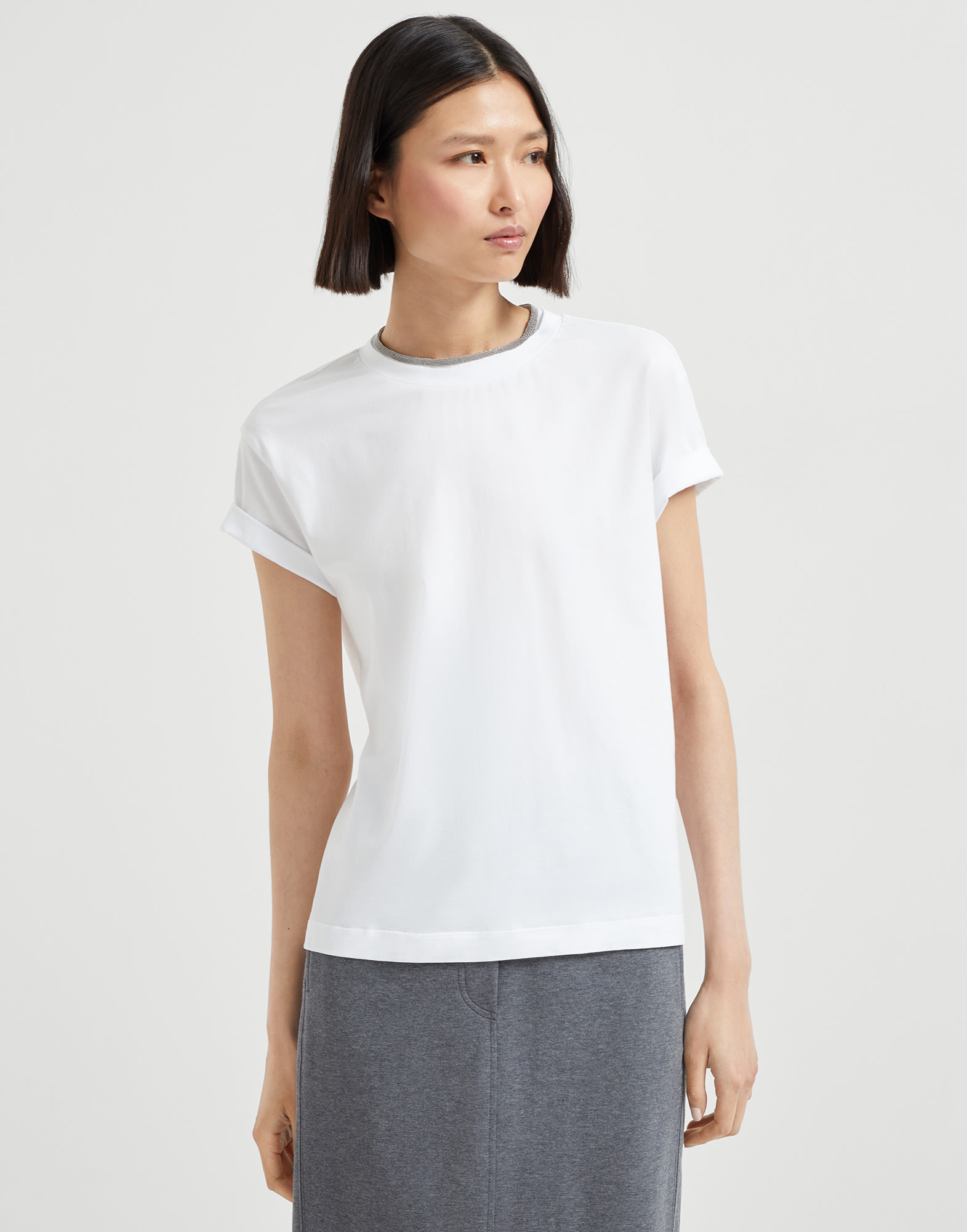 Precious embellishments enrich the sporty feel of this short sleeve T-shirt in cotton jersey. Perfect for different styles and creating countless outfits, the garment features a comfortable, regular fit. The monili embroidery runs along the crew-neck, providing a feminine sparkling note.