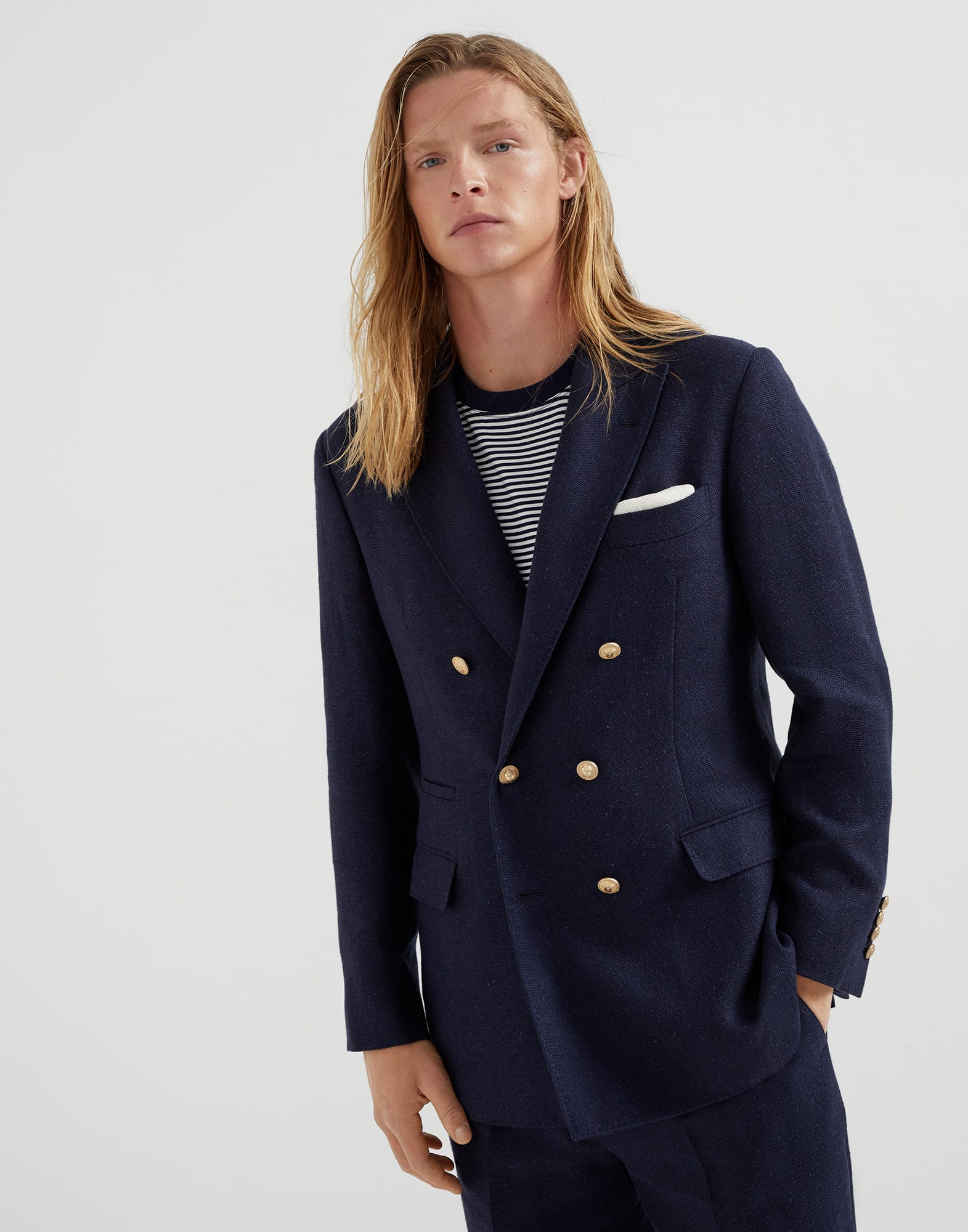 Nautical inspiration and a retro feel are paired with the timeless allure of this unconstructed blazer with a one-and-a-half-breasted closure, peak lapel and metal buttons. The linen, silk, wool and cotton fabric’s diagonal twill weave highlights the characteristics of the individual yarns and the textured striped pattern. The “Solomeo Shoulder”, named after the hamlet where the company is located, characterizes the Brunello Cucinelli blazer with signature proportions. The tapered and pronounced cut of the shoulder enhances the male physique without the need for padding.
