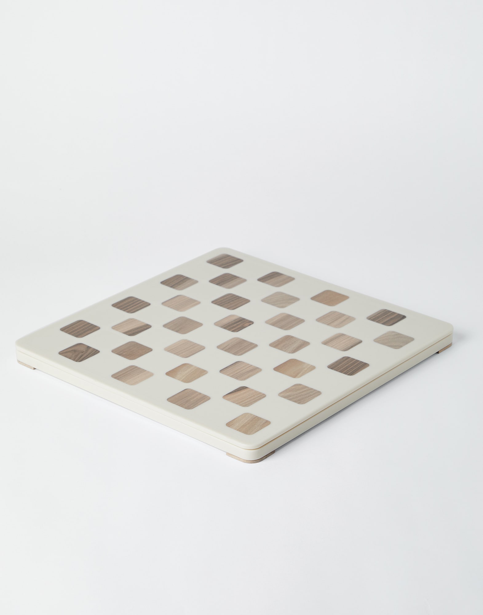 This Krion®, walnut wood and Steel checkers set is a precious artisanal accessory with essential, contemporary lines. The board alternates the matte, even surface of Krion® with walnut wood inlays with warm, streaked notes. The wood and Steel pieces can be stored easily and safely inside the box, allowing this piece to serve as an elegant decorative accessory for the home.