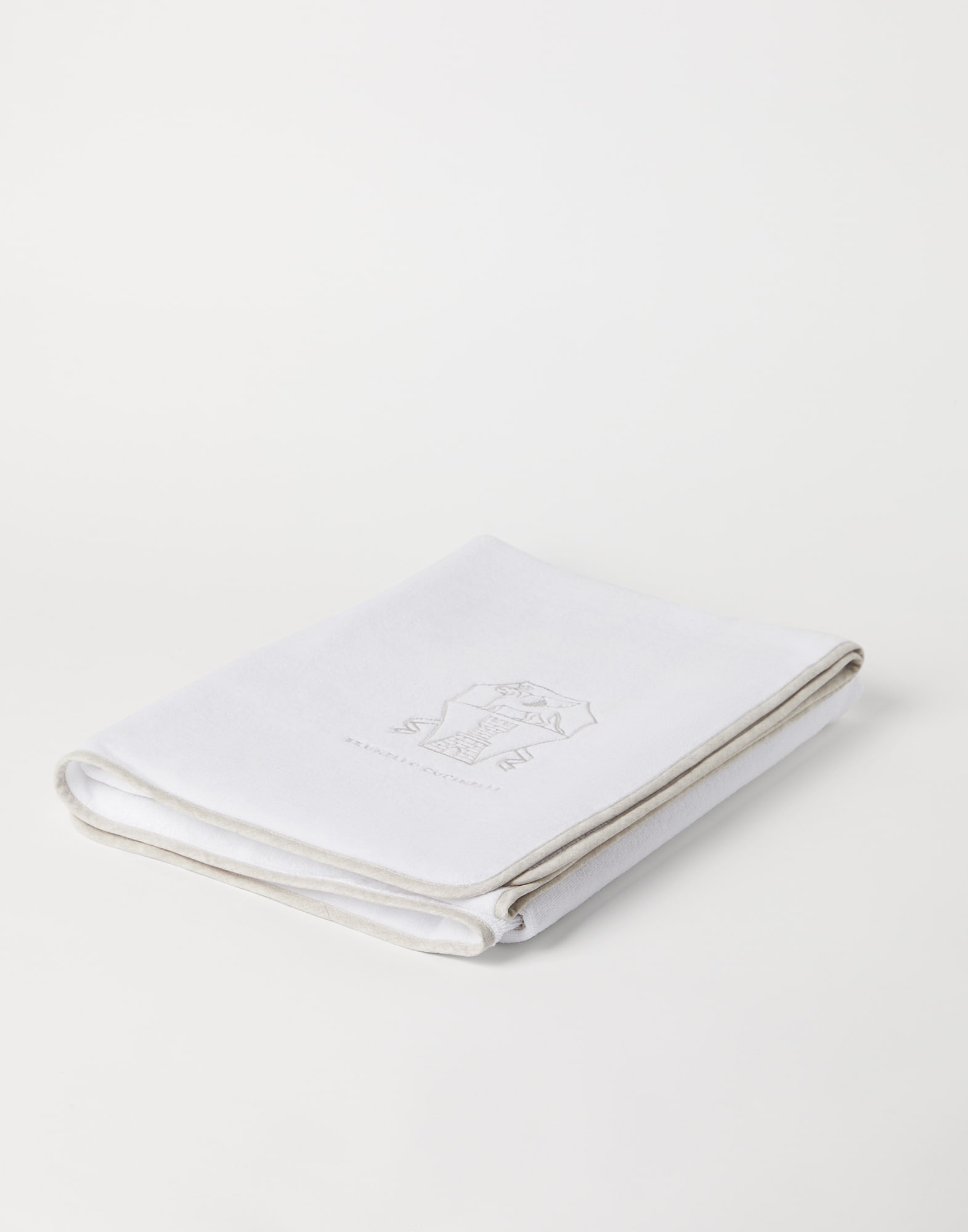 Perfect for moments of relaxation at home or outdoors, this bath towel is enriched with soft cotton terrycloth. The embroidery of the heraldic logo ties back to the same color as the linen fabric used along the edges to create texture and color contrasts in true Brunello Cucinelli style.