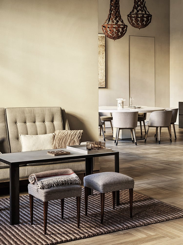 Between traditional influences and modern inspirations, Casa Cucinelli in Milan harmoniously occupies a cosmopolitan corner of the city while preserving the soul of an intimate haven. Located in an elegant neo-Renaissance building, it features a courtyard with classic Milanese architecture that warmly welcomes guests. Inside, the design elements of the Casa blend with Solomeo's cultivated atmosphere, creating a setting that is both contemporary and authentic.