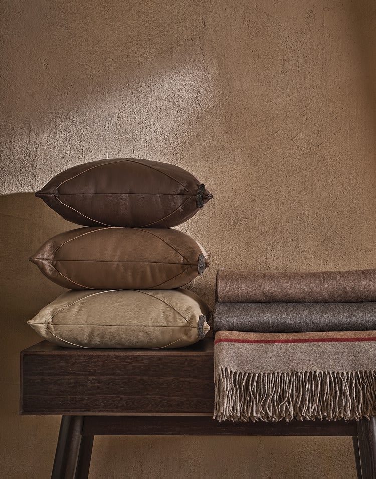 Cotton knit decorative design cushions, in large or small sizes, enrich the spaces with soft textures and essential lines. Paired with coordinated poufs or leather details, they give balance and coziness to the most stylish interiors.