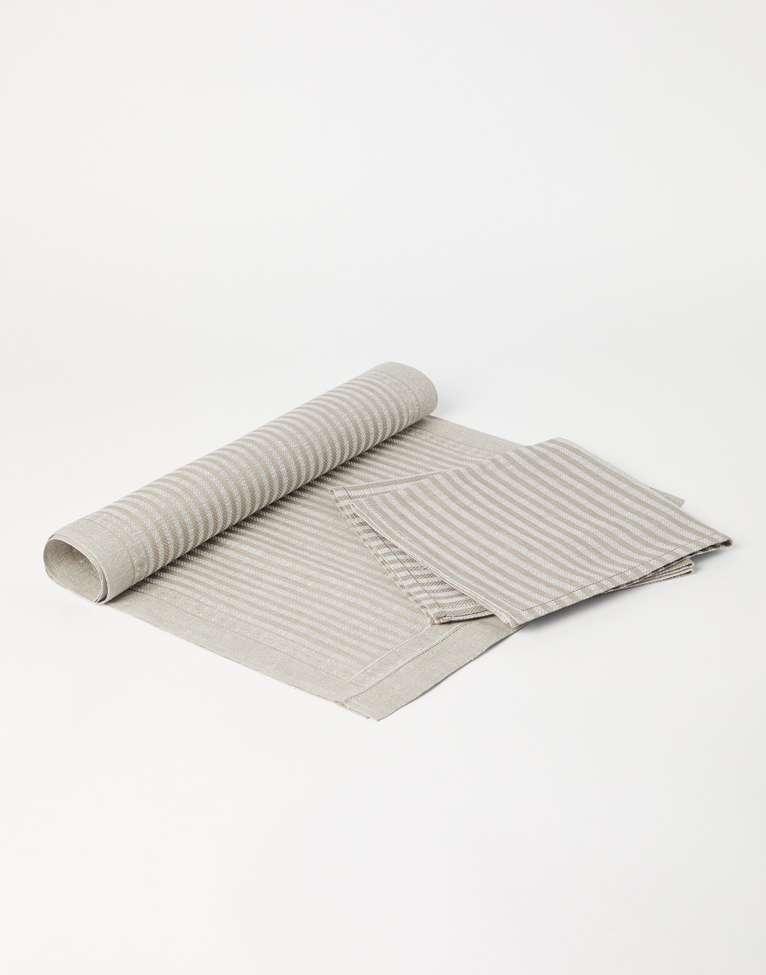 This runner and 2-piece napkin set will enrich social gatherings spent around the table with a sophisticated touch. Loom weaving creates a chalk stripe pattern that enhances the natural beauty of the linen fiber.