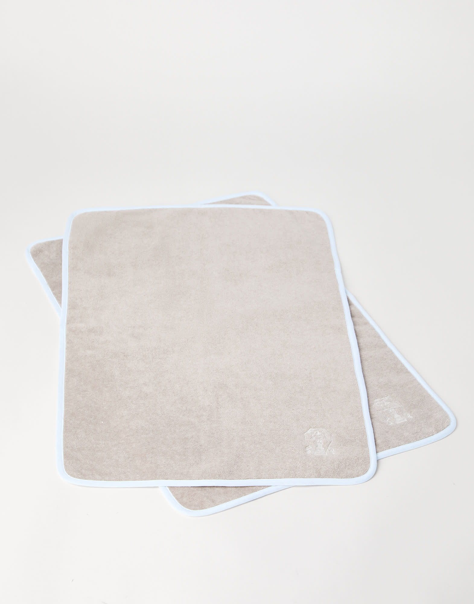 The soft touch of pure cotton terrycloth enriches this 2-piece towel set with the excellence of Brunello Cucinelli materials. The fabric showcases a textured appearance on the underside, while the exterior is smooth and uniform. The summery touch of the contrasting linen trim is paired with the tonal embroidery of the Solomeo heraldic logo for a sophisticated touch.