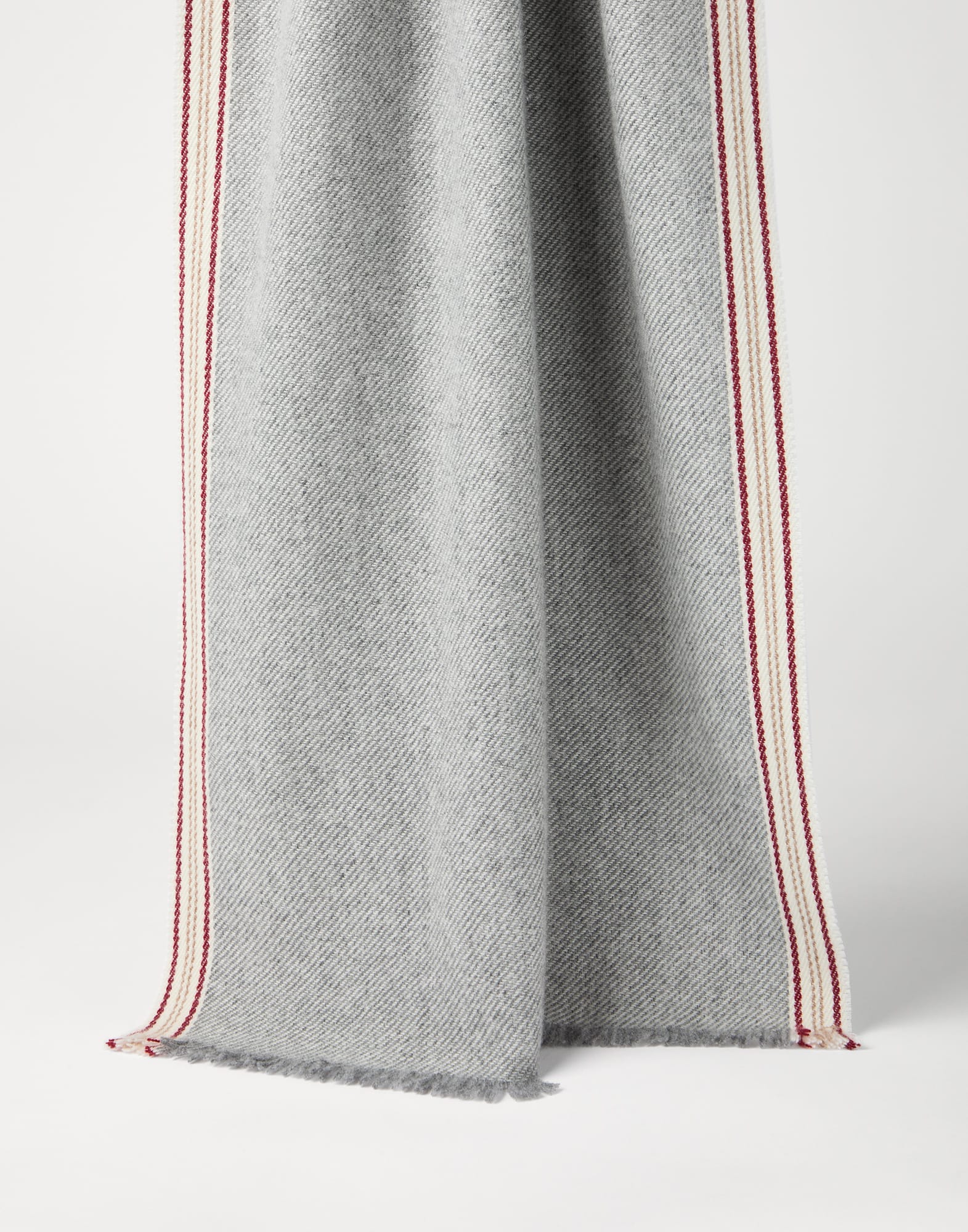 The excellence of Brunello Cucinelli cashmere enhances the essential style of this scarf, providing ideal comfort and protection during the colder months. A contrasting stripe enriches the long side of the accessory, completed by fringed edges.