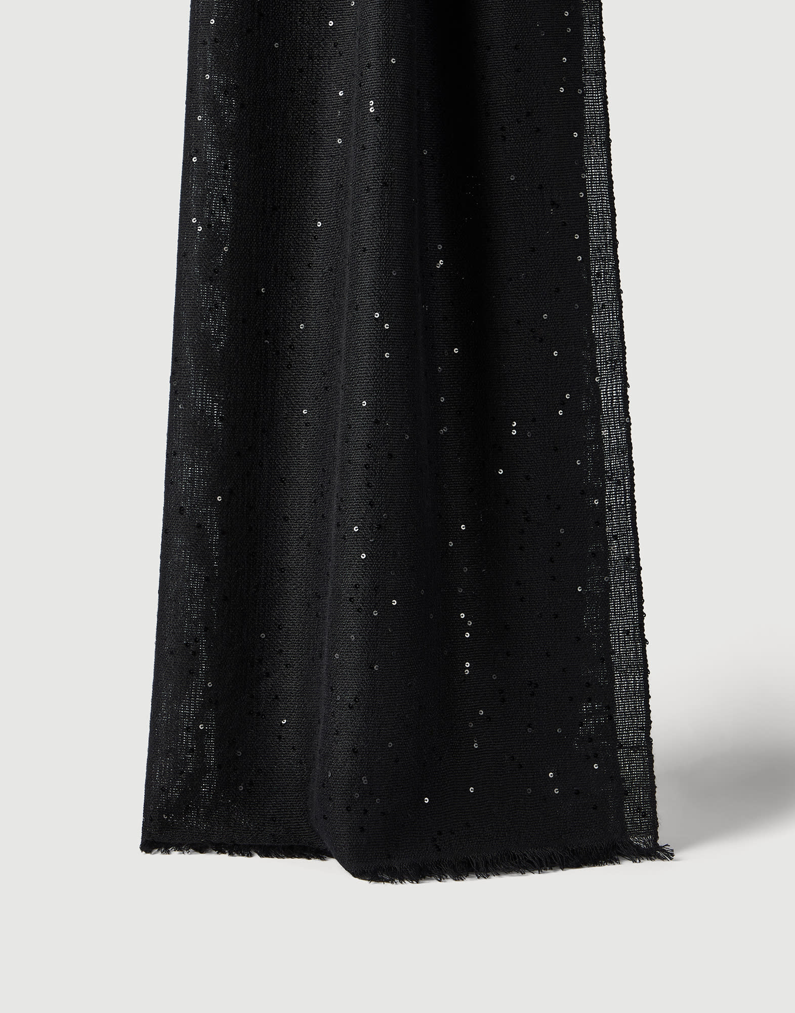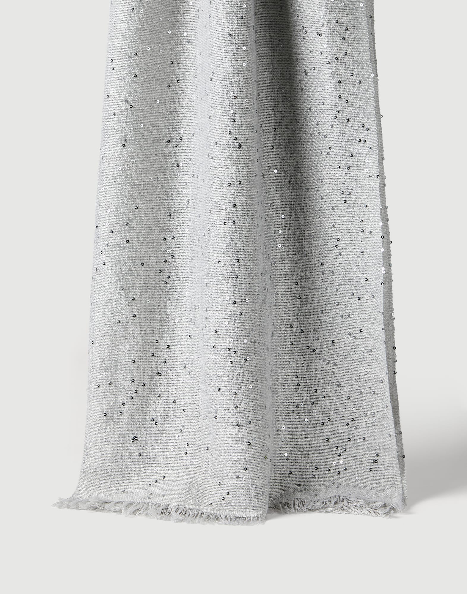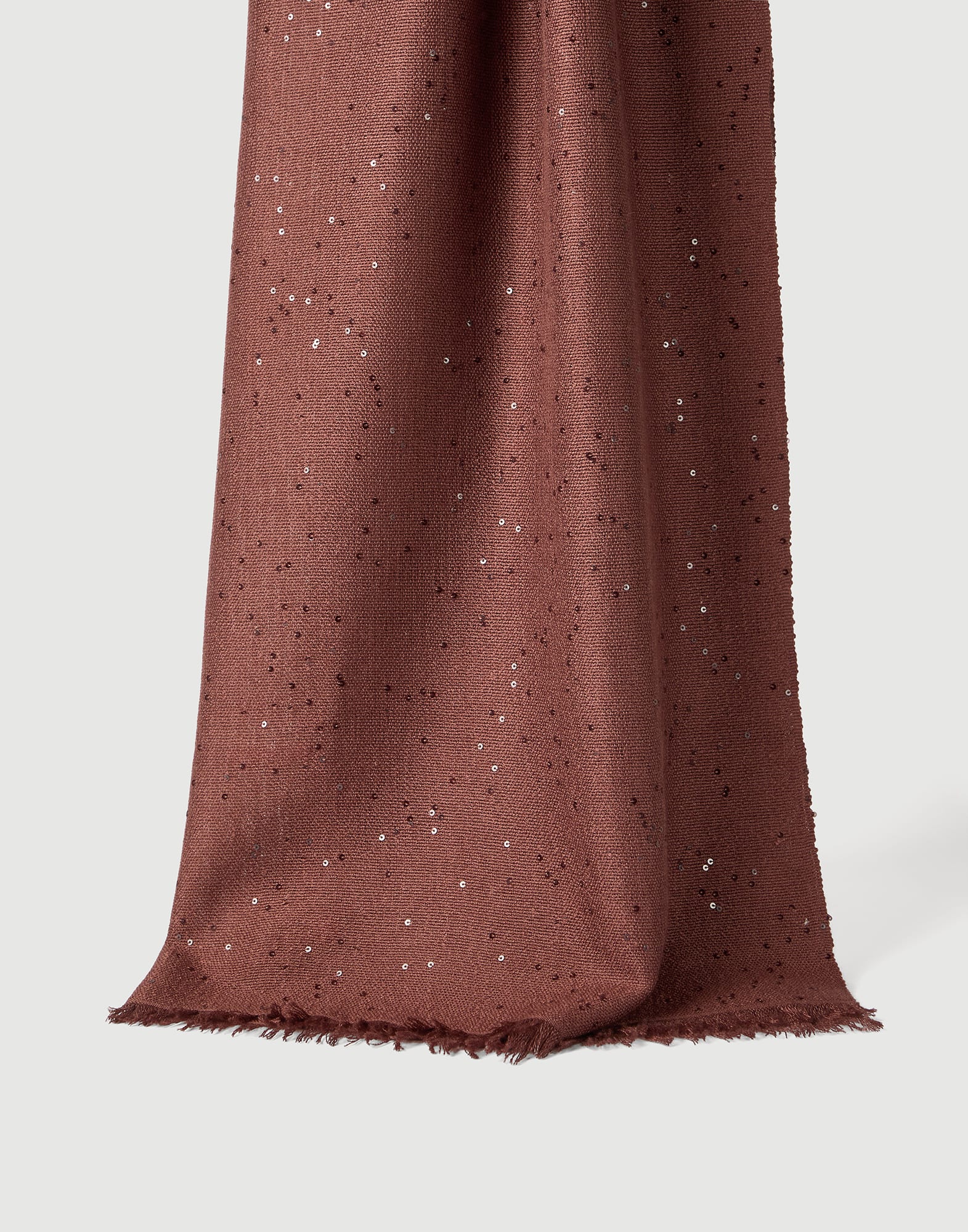 A sophisticated and shimmering look define this new cashmere and silk Diamond yarn scarf. The surface’s shiny reflections provide the accessory with a sparkling note. The fringe edges complete the style of the scarf with a bold touch.