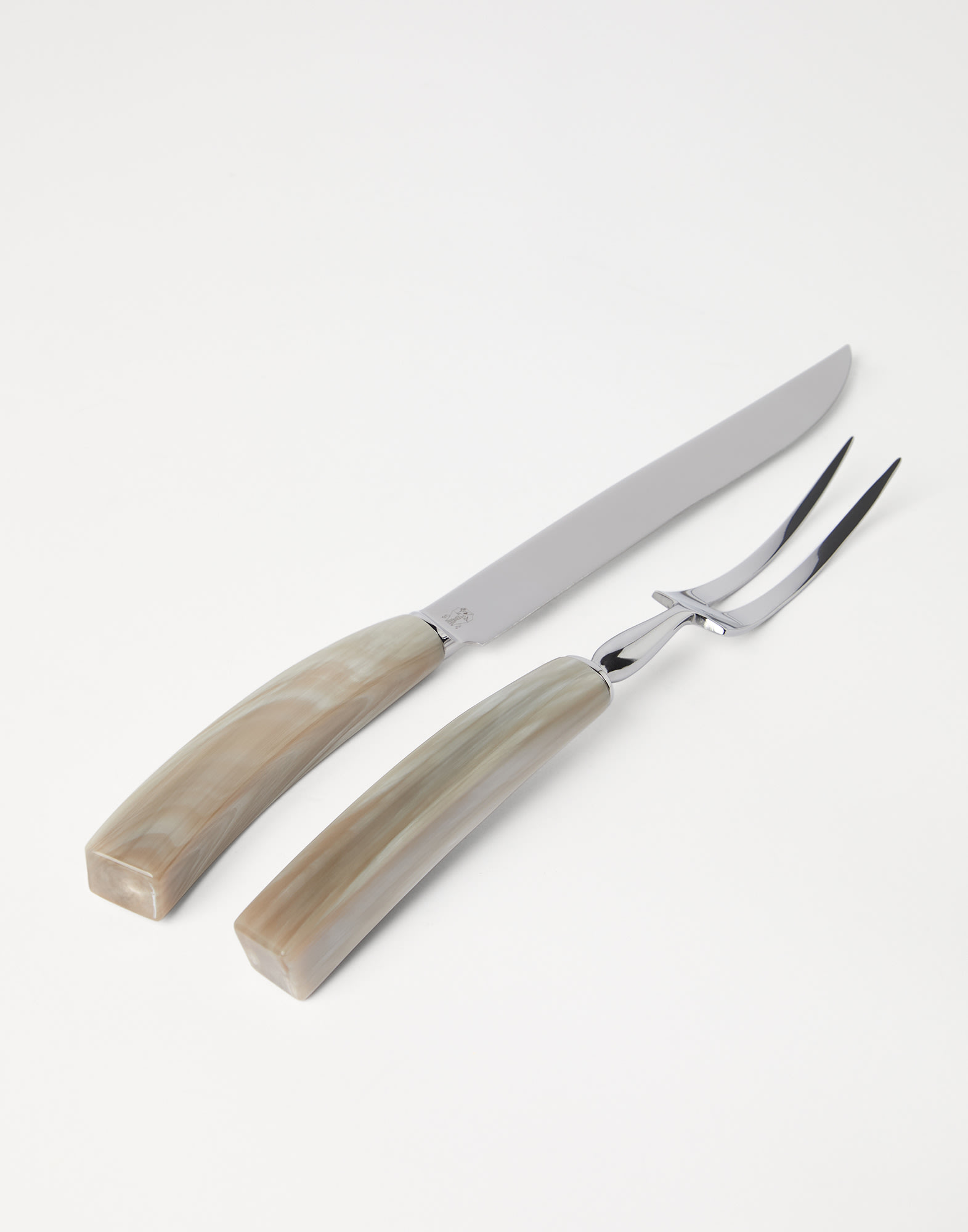 Consisting of a fork and a knife, this roast carving set is made of Stainless Steel. The handmade geometric buffalo horn handles showcase slight natural veining that helps to make each piece unique.