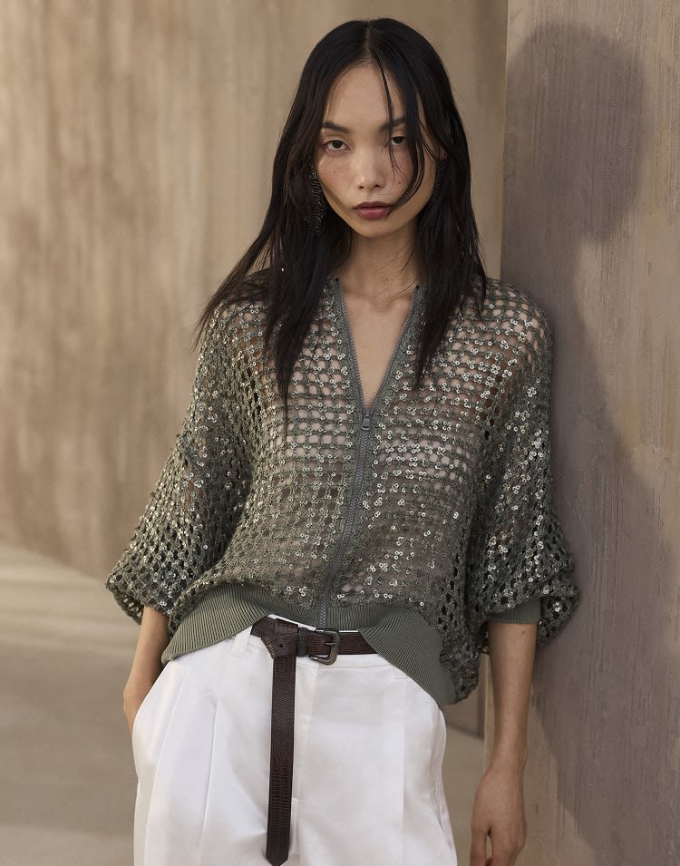 A fine expression of craftsmanship and refined taste, the Women's Knitwear by Brunello Cucinelli offers pullovers and sweaters, cardigans and tops with clean lines and noble fibers. The enveloping textures and sophisticated workmanship enhance femininity with natural elegance and comfort. Each creation reflects a harmonious balance between contemporary style and authenticity, accompanying every moment with a refined taste.