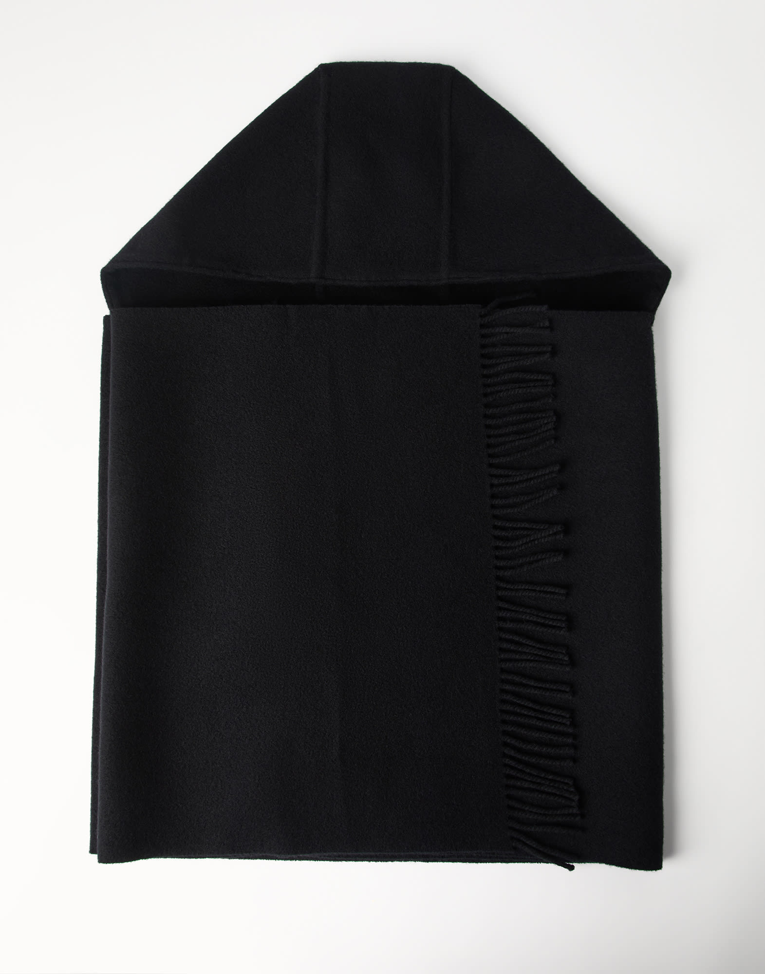 The excellence of refined fabrics enhances the essential style of this wool and cashmere knit scarf. Perfect for the winter, the precious yarn provides a comfortable feeling of softness. The fringe and hood complete the style with a casual touch.