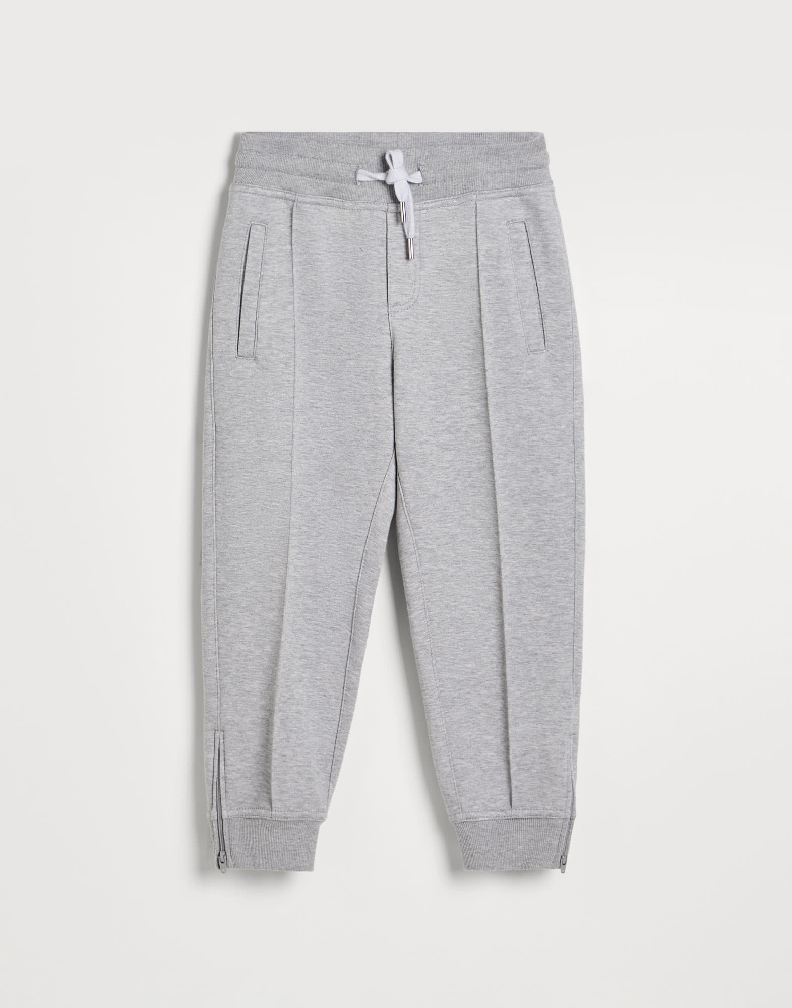 The Travelwear line provides children with the soft and cozy sensations of precious fibers through its sporty garments designed for relaxing or playing. These cotton, cashmere and silk double French terry trousers are characterized by a Crête, a treatment inspired by tailored trousers that introduces the effect of a permanent crease down the leg. The waist drawstring and the ankle zippers provide comfort and complete the look of the garment.