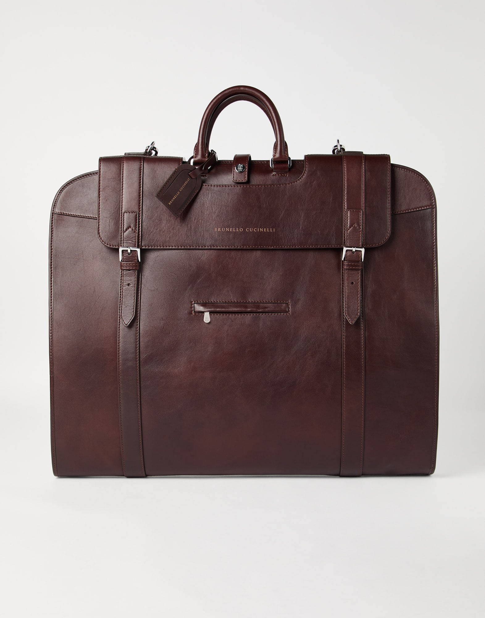 La unión entre los materiales refinados Brunello Cucinelli y un diseño de viaje funcional define el portatrajes. El accesorio está confeccionado en suave piel de becerro y cuenta con un cierre de correas regulables. Una vez abierto, el portatrajes dispone de un gancho interno que permite colgarlo para una mejor organización de las prendas, que quedan protegidas por un largo cierre de cremallera. El accesorio cuenta con un sistema especial de encastre para colgar las perchas. Las asas dobles y la correa ajustable facilitan el transporte.