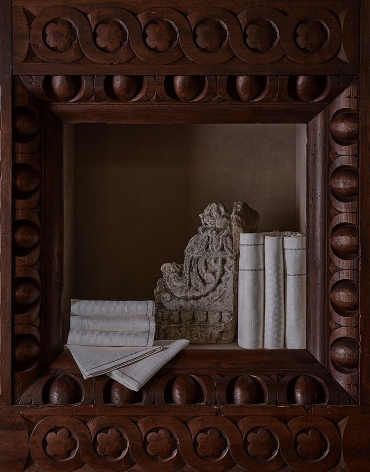 La mantelería se enriquece con manteles individuales y caminos de mesa de lino natural, donde los tejidos refinados y la confección artesanal expresan una elegancia sobria. Los motivos a rayas y los matices neutros acompañan con armonía cada momento de convivencia.