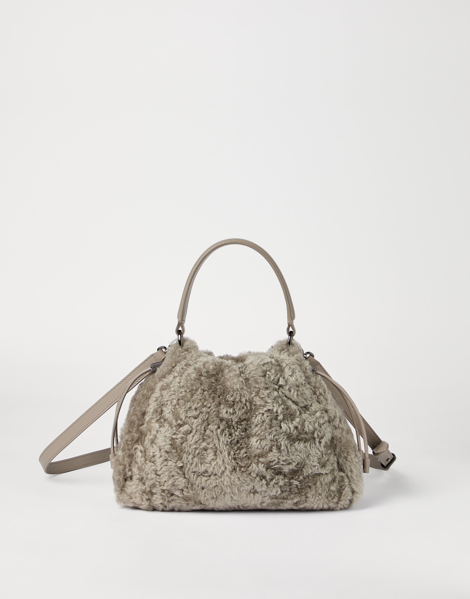 Des matières prestigieuses et des décorations féminines se rencontrent sur le sac Bucket Mellow petit format. La texture spéciale, douce et volumineuse, de la peau de mouton Fuzzy renforce la douceur du modèle, resserré par la pratique coulisse de fermeture. La poignée permet de porter le sac à la main, tandis que quatre fils de Monile précieux forment la bandoulière qui illumine l’accessoire de reflets éclatants, en pur style Brunello Cucinelli.