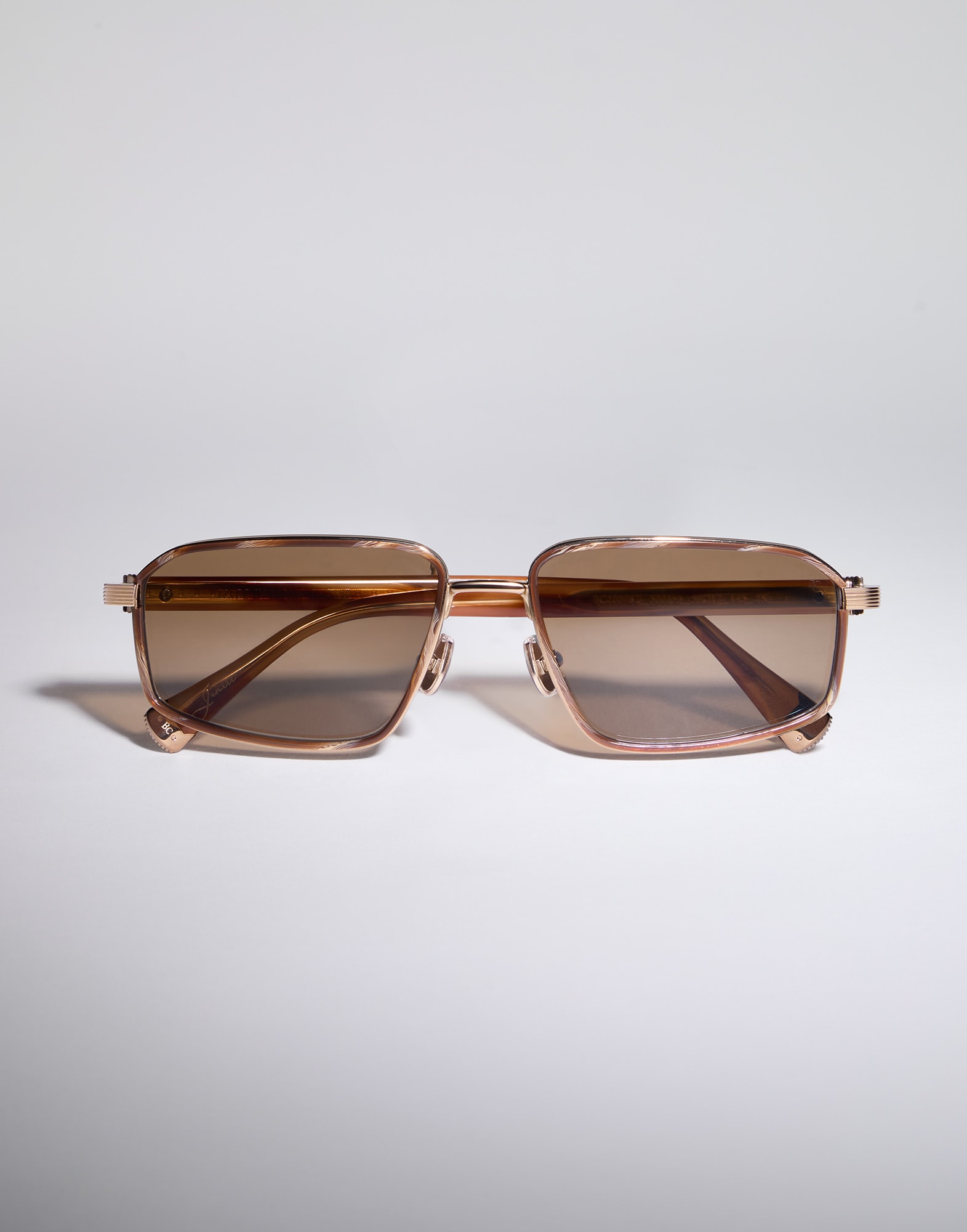 Un design aux nombreux détails recherchés et précieux caractérise les lunettes de soleil Jarama en titane, réalisées au Japon. Les lignes géométriques sont mises en valeur par le raffinement des exécutions artisanales comme le rainurage sur la partie initiale des branches en acétate et sur les embouts, avec le motif gravé à la main en filigrane qui orne l’âme en métal, inspiré des collections de prêt-à-porter Brunello Cucinelli. Une fine gravure au laser à l’intérieur de la branche marque le modèle de la signature « Jarama ». Les lunettes font partie de la ligne "Intarsia Rays" où des exécutions manuelles précieuses et des détails tridimensionnels se succèdent dans un ensemble équilibré et élégant. Des éléments incrustés attirent la lumière des rayons et valorisent la nature recherchée de chaque modèle.
