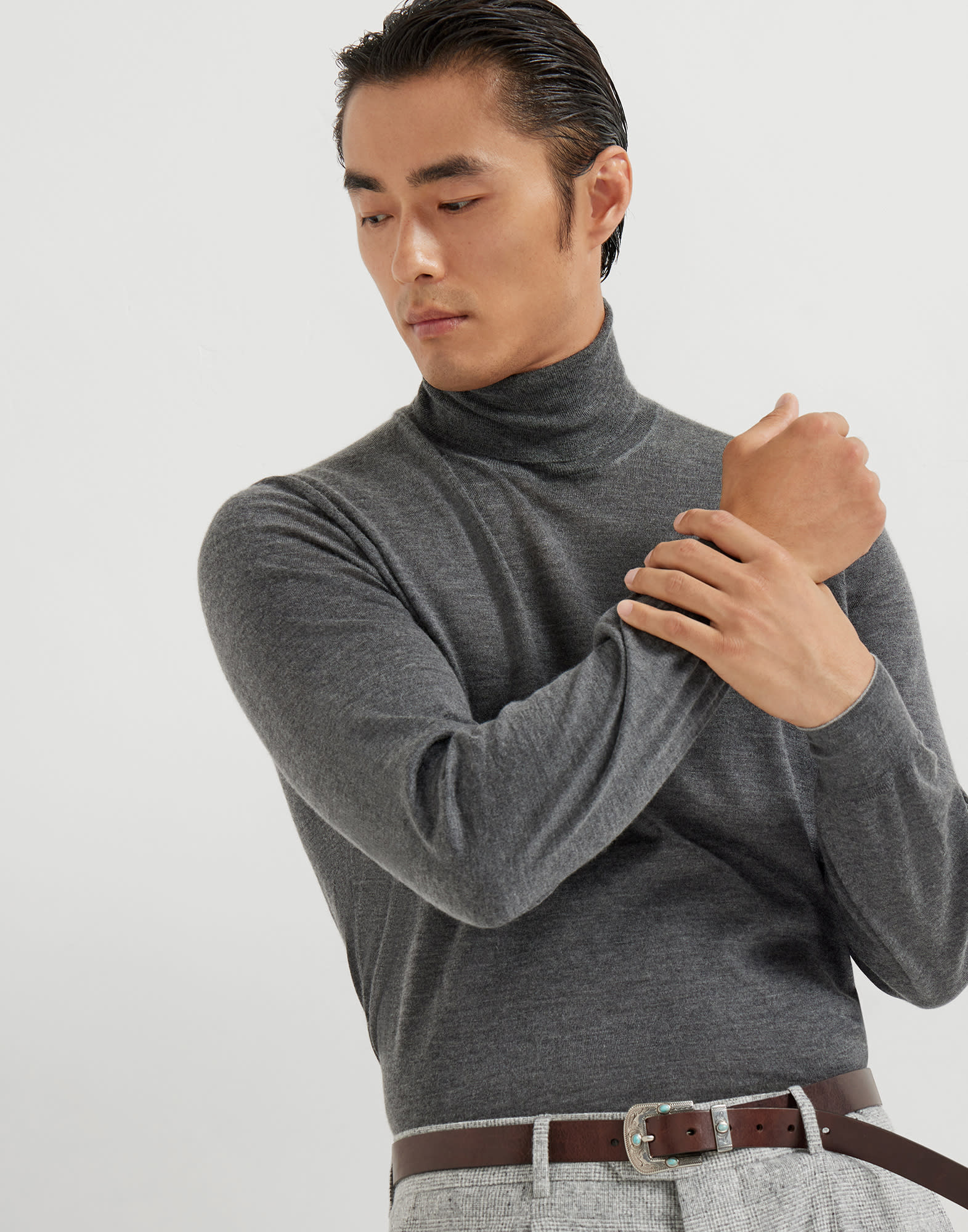 Le prestige des fils Brunello Cucinelli met en valeur les lignes essentielles du col roulé à manches longues, un incontournable de la garde-robe masculine. Le vêtement en maille légère combine des fibres de cachemire et soie en un seul fil, qui sublime les couleurs de la saison grâce à une texture douce, chaude et moelleuse. La coupe présente des volumes droits et confortables.