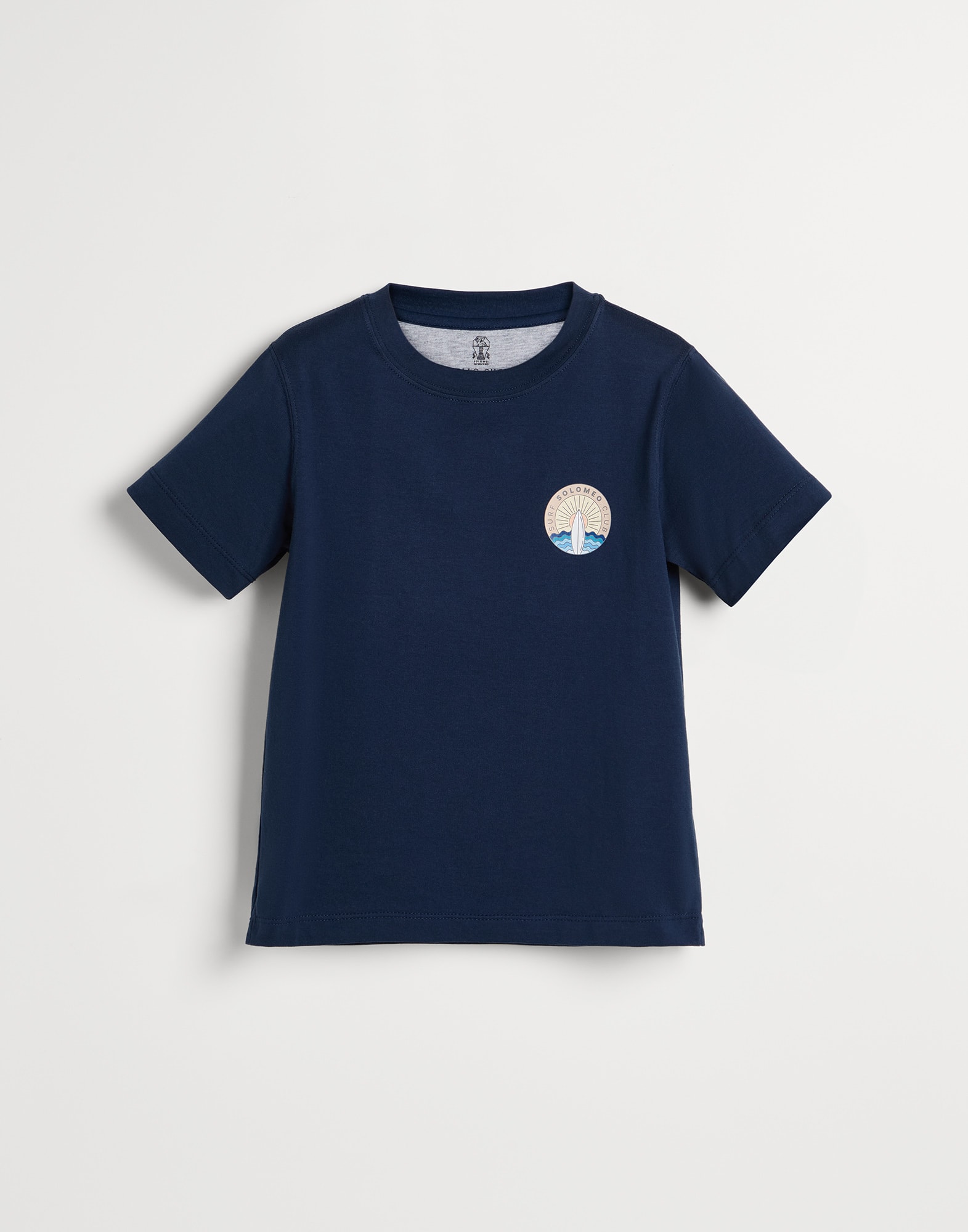 La pratica T-shirt in jersey di cotone è caratterizzata dalla stampa 'Solomeo Surf Club' che richiama l'universo dello sport e dell'estate, reinterpretato in chiave raffinata.