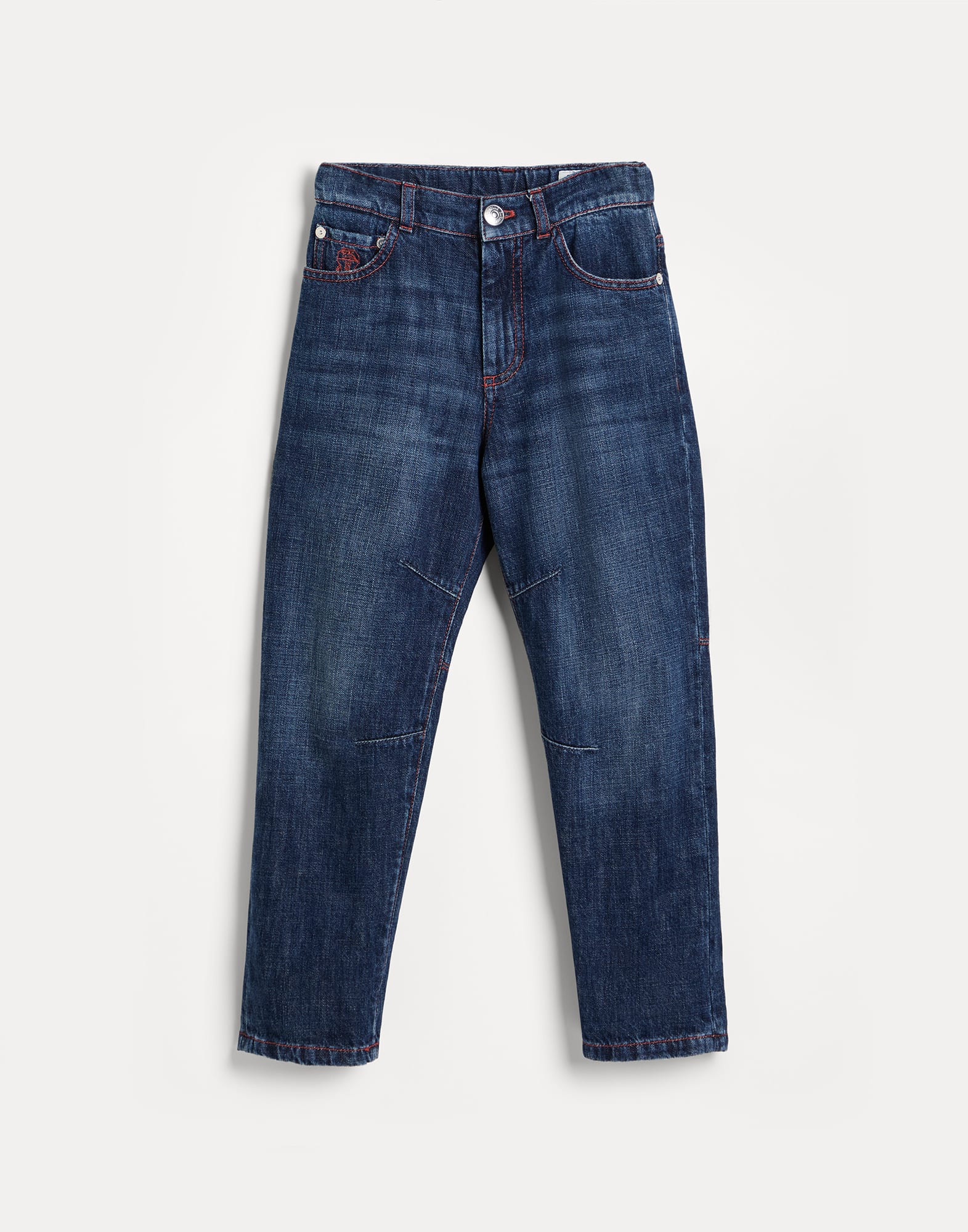I pregiati materiali e i dettagli ricercati che caratterizzano il pantalone cinque tasche in denim leggero sono i medesimi che si ritrovano all'interno della collezione Uomo Brunello Cucinelli. Le caratteristiche doppie cuciture a contrasto definiscono lo stile del capo con una nota vivace e sportiva, mentre la vestibilità rilassata favorisce il comfort all'indosso.