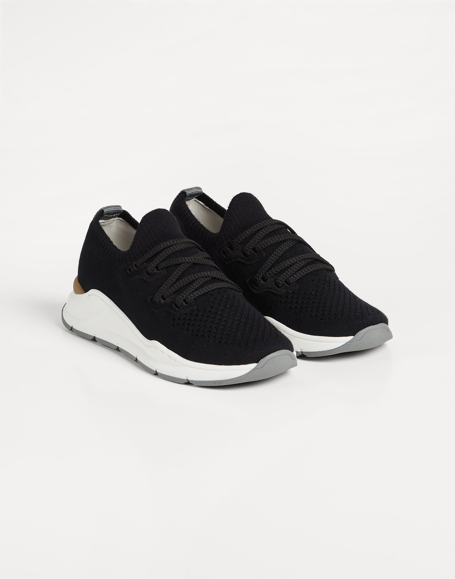 I classici filati della maglieria Brunello Cucinelli ispirano il gusto ricercato e sportivo delle runners. La tomaia è composta da una maglia chiné, leggerissima ed elasticizzata, che mostra un aspetto compatto sui lati mentre sulla punta è lavorata con la tecnica del "micro-foro", caratteristica degli accessori sportivi. L’elasticità della maglia garantisce aderenza e massimo comfort alla calzata.