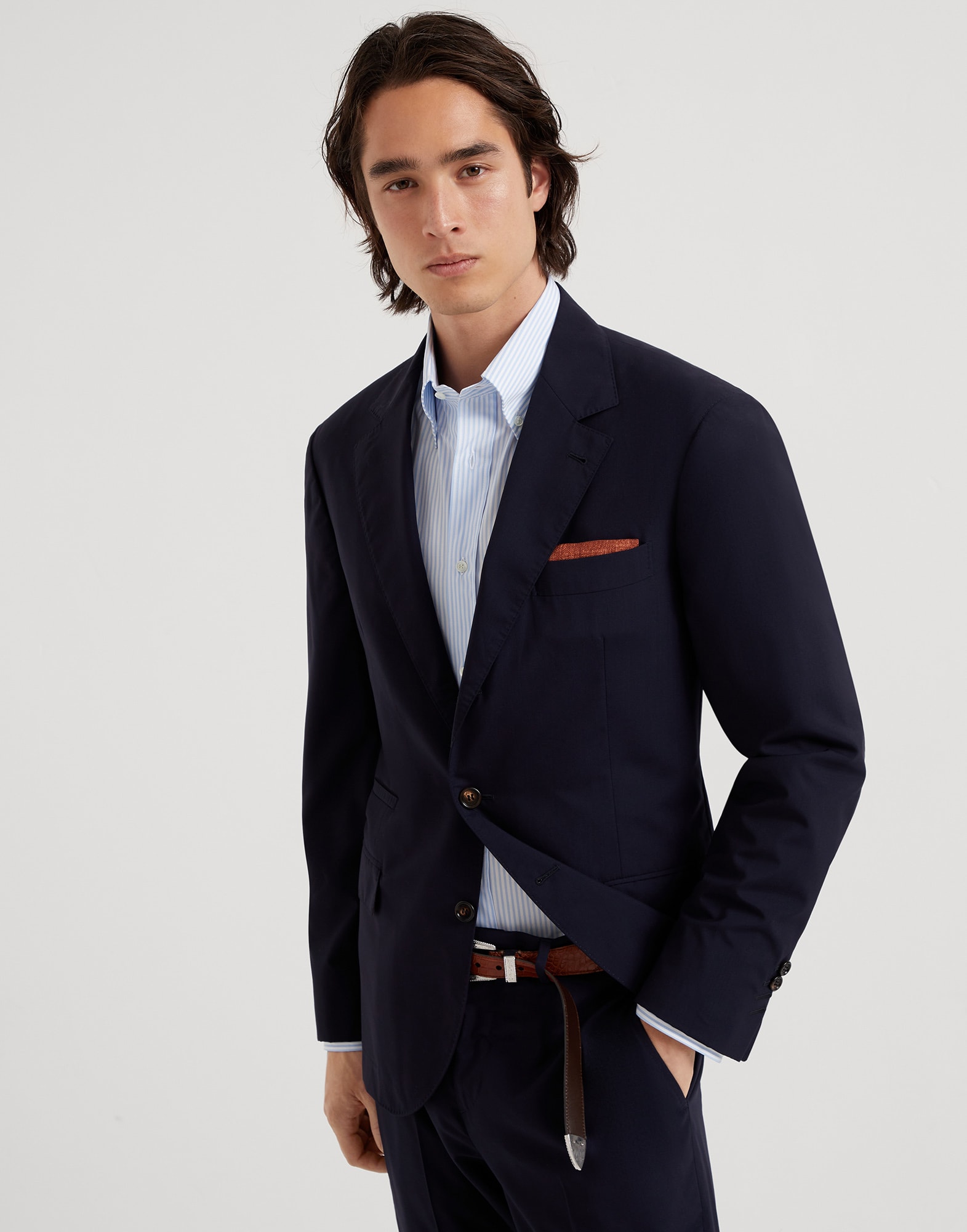 La silhouette versatile ed essenziale del blazer si innalza grazie al pregio dei materiali Brunello Cucinelli nella giacca in lana e seta 150's. La texture fluida e leggera della tela esalta le nuance di stagione e le linee essenziali del capo. La vestibilità segue le proporzioni che contraddistinguono lo stile Brunello Cucinelli: accostata al busto per sottolineare la fisicità maschile, con spalle leggermente in evidenza.