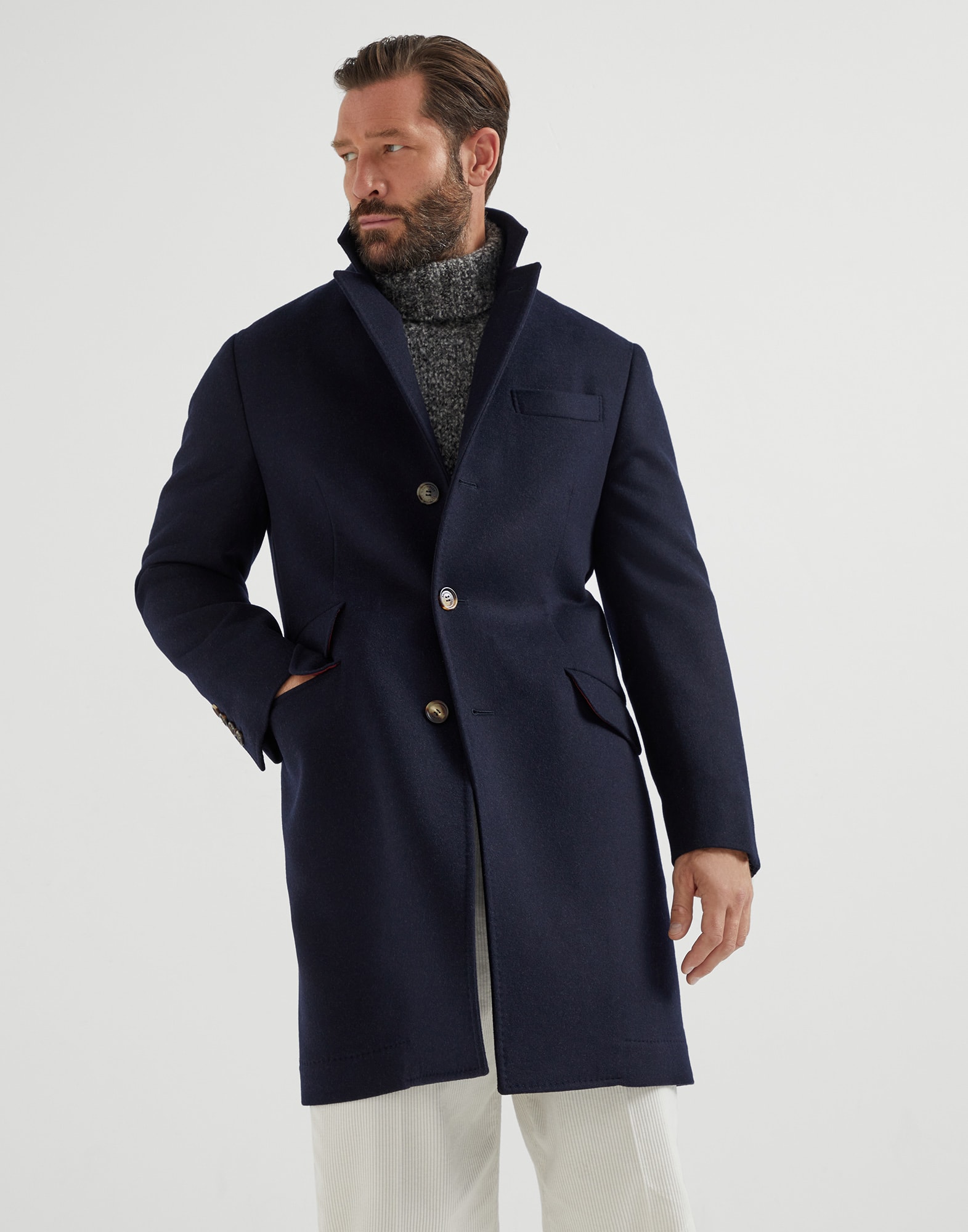 Profili di ispirazione sartoriale e materiali di pregio definiscono il gusto ricercato e discreto del cappotto in flanella di pura lana. Il calore e la leggerezza delle fibre naturali sono esaltati dalla texture delicata della flanella e dalla lavorazione double artigianale, che garantisce finiture impeccabili. La vestibilità con doppio spacco favorisce una silhouette dinamica e confortevole.