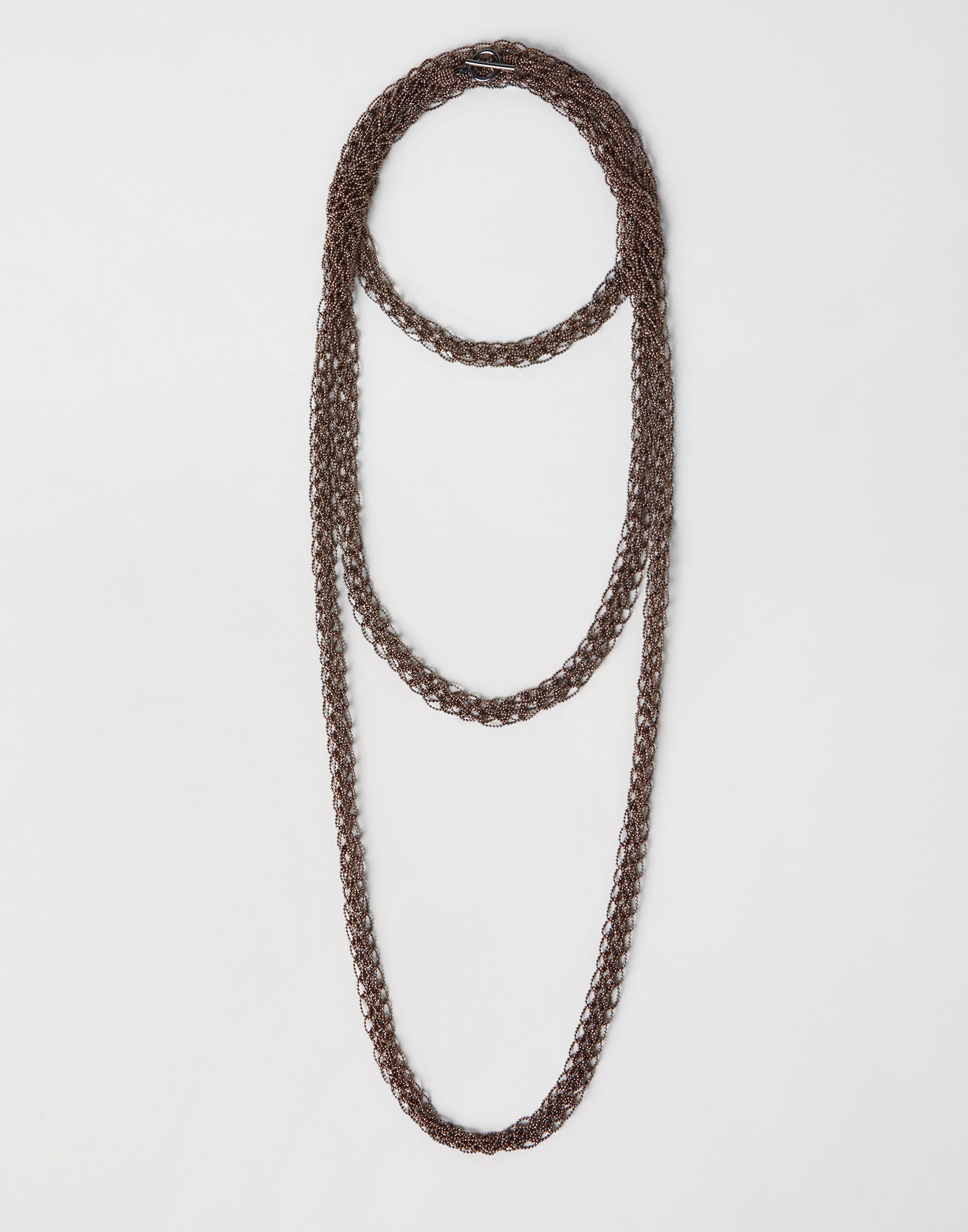 Il monile, elemento iconico delle collezioni Brunello Cucinelli, è composto da sottili file di perline di ottone placcato in diverse tonalità. Il taglio sfaccettato delle perline enfatizza le brillanti tonalità del monile. Tutte le parti in metallo sono rivestite con materiali preziosi che sostituiscono totalmente il Nickel, e arricchiscono il valore di ogni singolo dettaglio.