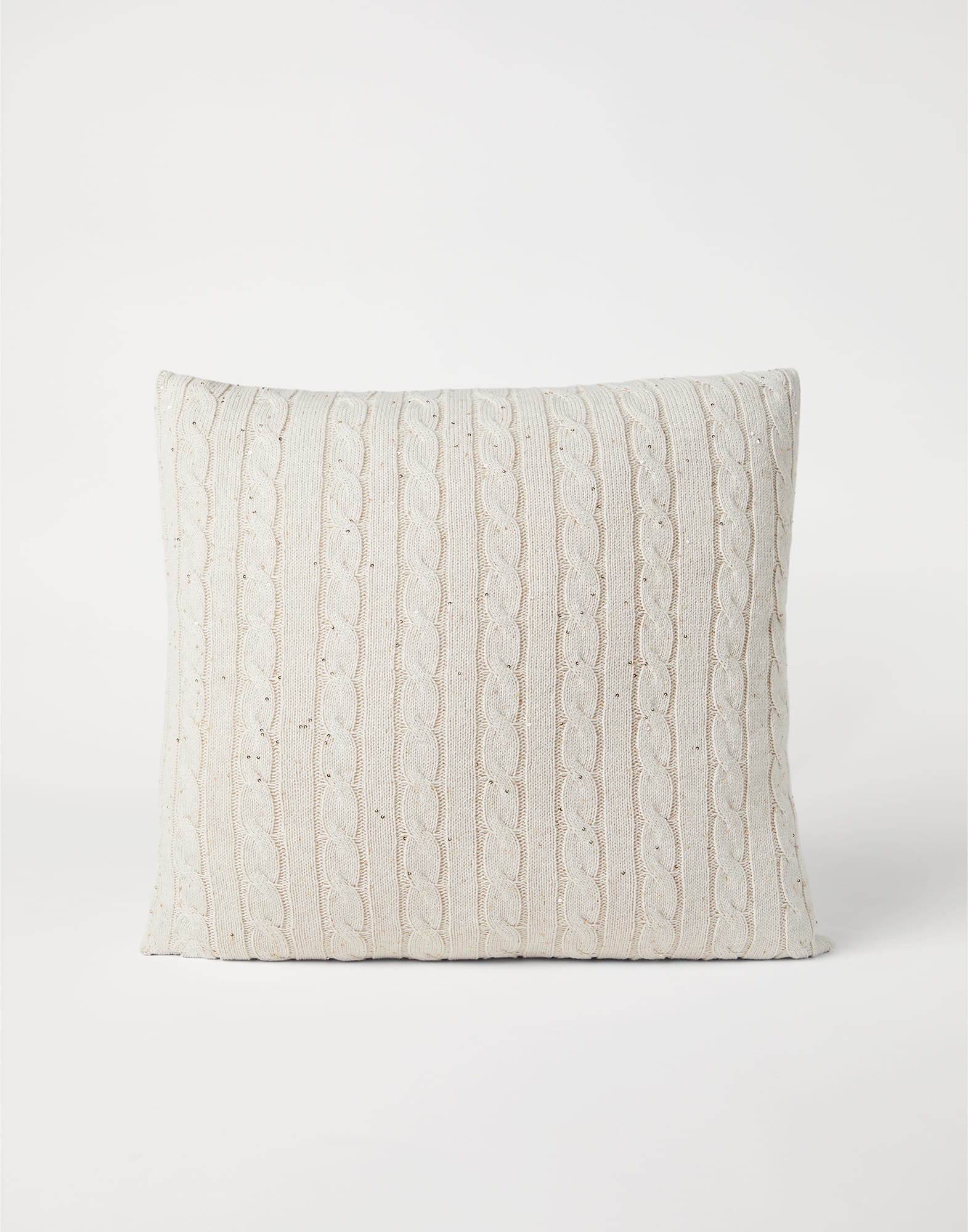 Le iconiche tonalità neutre delle collezioni Brunello Cucinelli arricchiscono il cuscino con cover in maglia Dazzling Cables di cotone. La classica lavorazione della maglieria è abbinata all'effetto lucente del filo di paillettes che diffonde riflessi eleganti sulla superficie dell'accessorio.