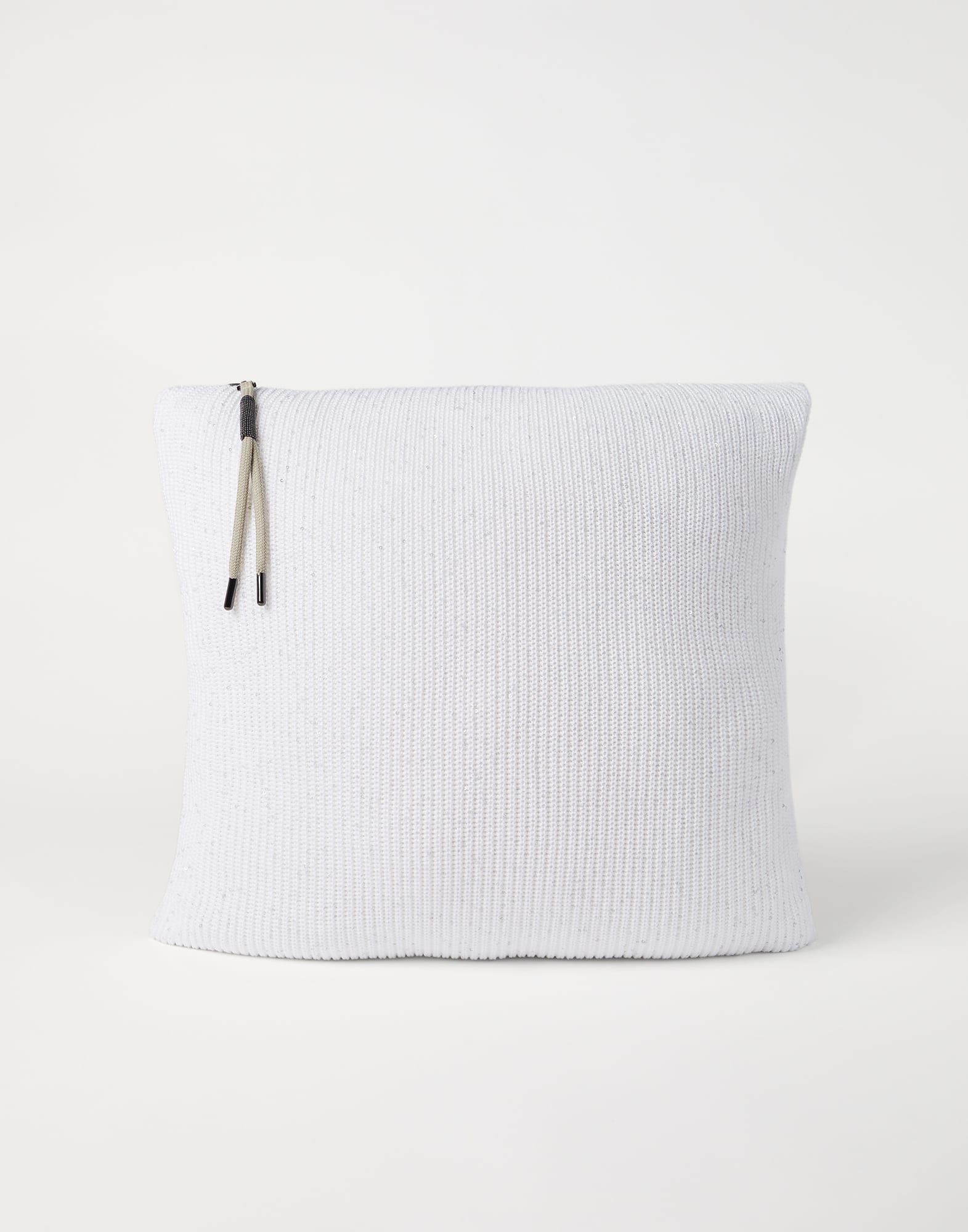 L'iconico filato Dazzling arricchisce il cuscino in maglia di cotone con un gioco di riflessi lucenti ed eleganti, grazie alla presenza delle piccole paillettes ingabbiate nel filo che si diffondono sull’intera superficie. Il dettaglio Shiny Zipper Pull, motivo ricorrente ispirato alla collezione Donna, completa l'accessorio con un tocco prezioso.
