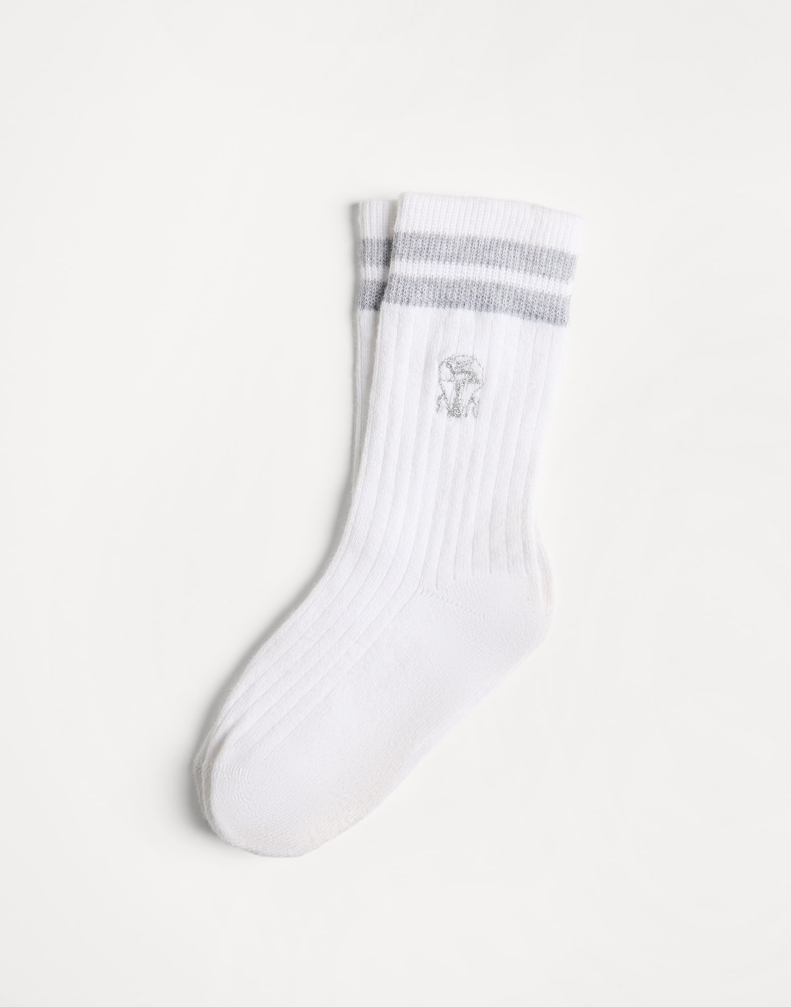 Brunello Cucinelliで使用する素材の高級感で、洗練されたタッチを添えたガールズ新作コレクションのリブコットンニットのソックス。上部の端にはストライプ柄で鮮やかな色合いとスポーティさを加え、刺繍ロゴでアイコニックなタッチをプラスして完成させました。