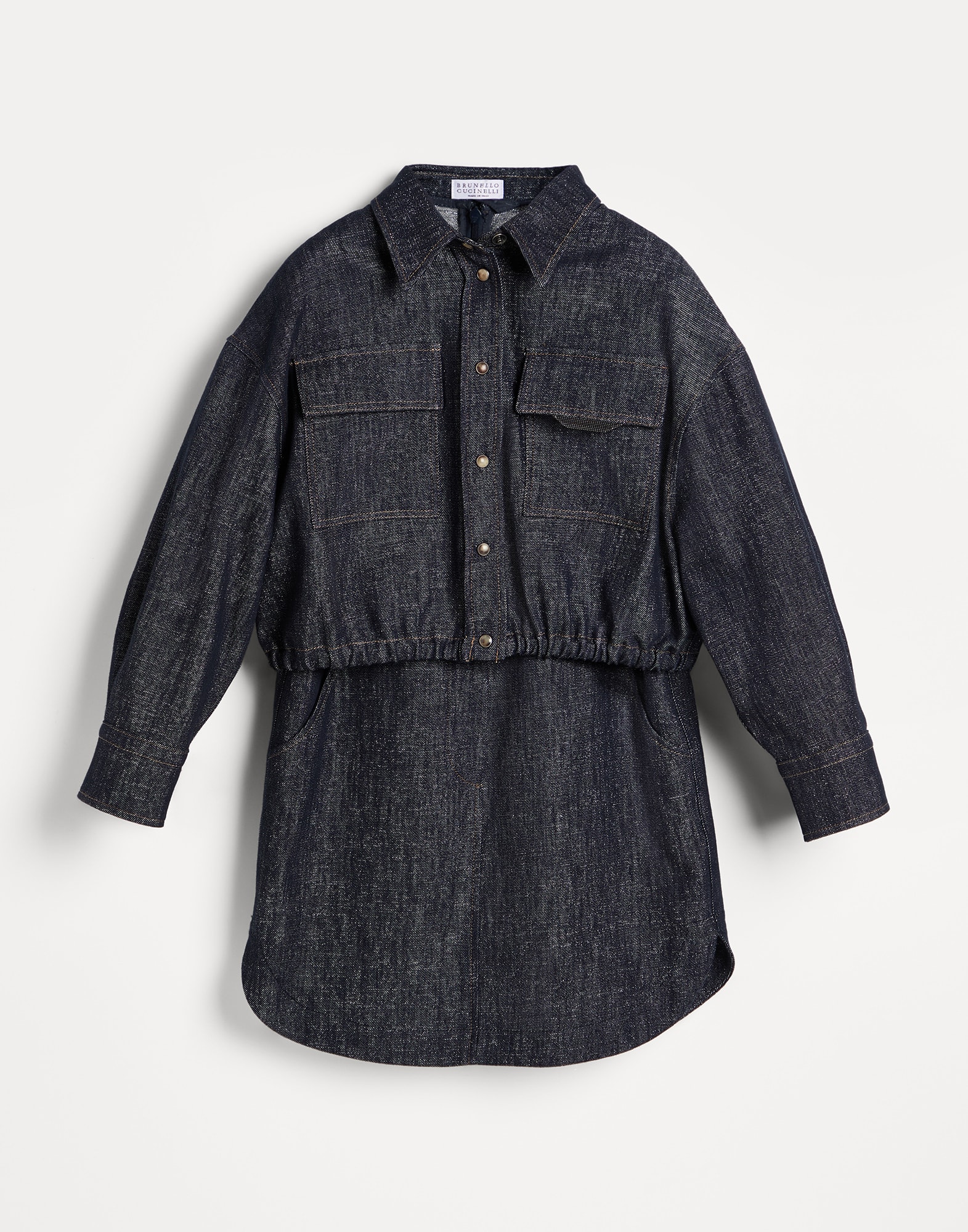 クラシックなラインに高級感を注ぎ入れてアレンジした、スパークリングノーフェードデニムのドレス。カジュアルな雰囲気が際立つモデルで、スナップボタン留め、胸ポケットをあしらったシャツをベースとするドレスがラメヤーンの輝きと出会うことで、趣向を凝らしたきらめきで全体に高貴さが広がっています。ブリリアントなモニーレを胸ポケットにほっそりと刺繍し、Brunello Cucinelliコレクションならではのタッチを施して仕上げたアイテムです。