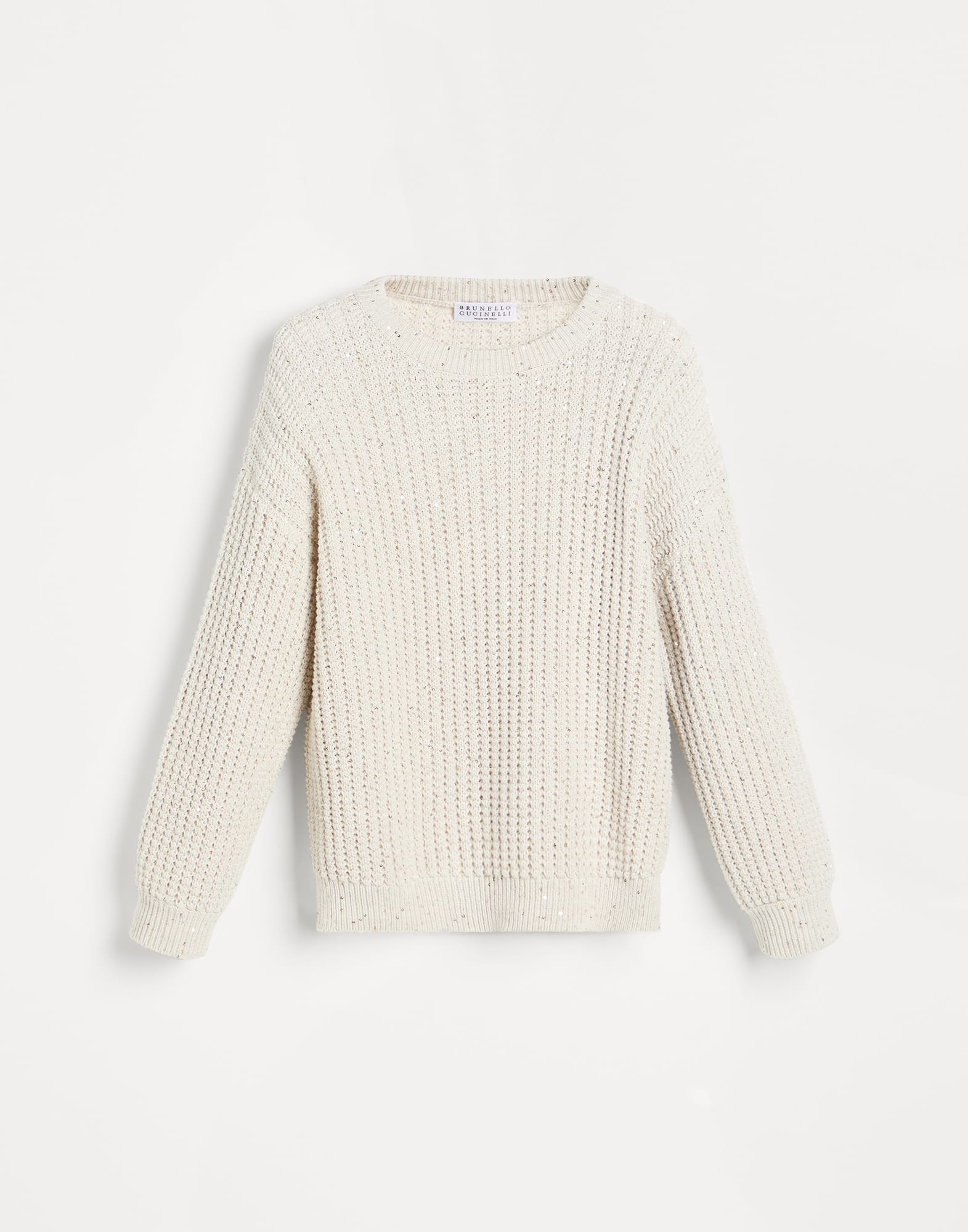 ガールズニットウェアでは、細部に至る心遣いと、Brunello Cucinelliスタイルならではの快適さ、そして高級素材がはっきりと現れています。このコットン製セーターでは、クラシックなリブ編みをダズリングヤーンのきらめきに合わせました。ドロップショルダーの、快適なボリュームのフィット感に仕上げています。