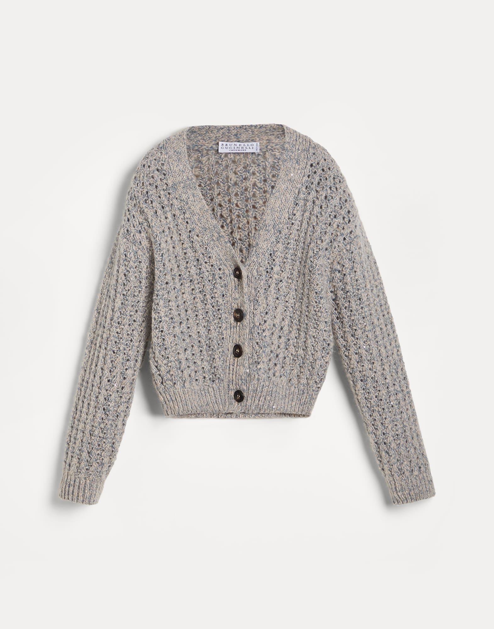 Brunello Cucinelliで使用される素材の高級感でガールズコレクションに洗練されたエレガンスを添えた、新作カーディガン。ソフトウール、カシミヤ、モヘアの柔らかなブレンドで作られたニット地は、クラシックなパターンを現代的に解釈した透かし編みが特徴となっています。繊細なスパンコールをあしらったラメヤーンで上品なきらめきを与えました。