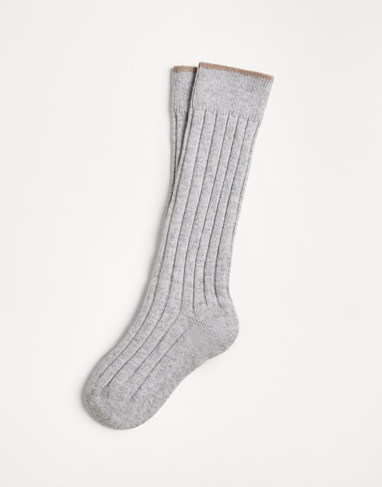 Brunello Cucinelliで使用する素材の高級感で、エレガントなタッチを添えたボーイズ新作コレクションのカシミヤリブニットのソックス。上部のトリミングには、色無地のテクスチャーとコントラストになった繊細な色使いを施し、アクセサリーの完成度を高めました。