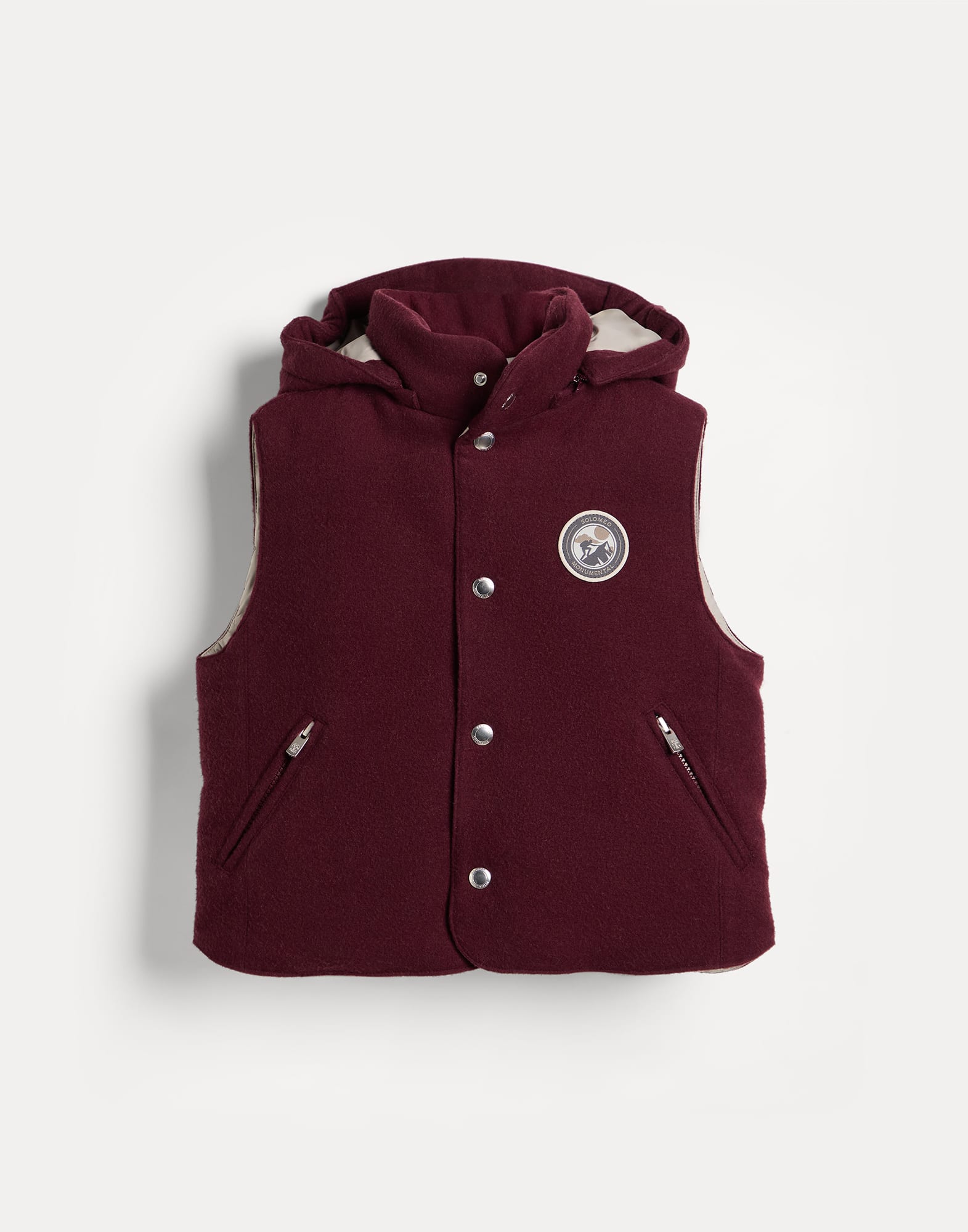 活躍の場の広さと保温力がスタイルのポイントとなった、取り外し可能なフード付きの新作ダウンベスト。バージンウールダブルフランネルのテクスチャーは、やわらかく快適なうえ、軽やかさが特徴です。このアウターウエアのカジュアルな雰囲気を、ハイキングウェアをヒントにしたワッペンで完成させ、小さな子どもたちを発見の喜びへと誘いました。