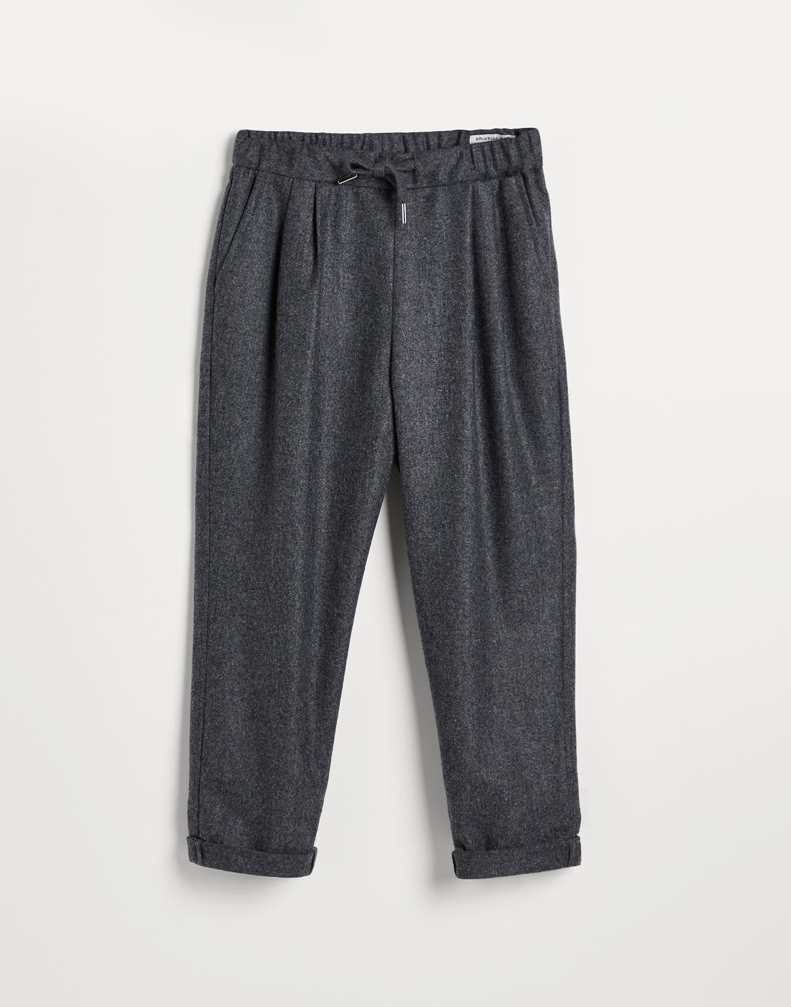 ボーイズコレクションでは、毎日のちょっとした冒険や、とびきりのイベントなど、様々なシーンでご使用いただくことを想定したラインのアイテムを取り揃えました。バージンウールフランネル製トラウザーズで保温力と温かさを与え、ドローストリングのスポーティなディテールをダブルタックのサルトリアル調と組み合わせて、バランスの取れたスタイリッシュさを作り上げています。