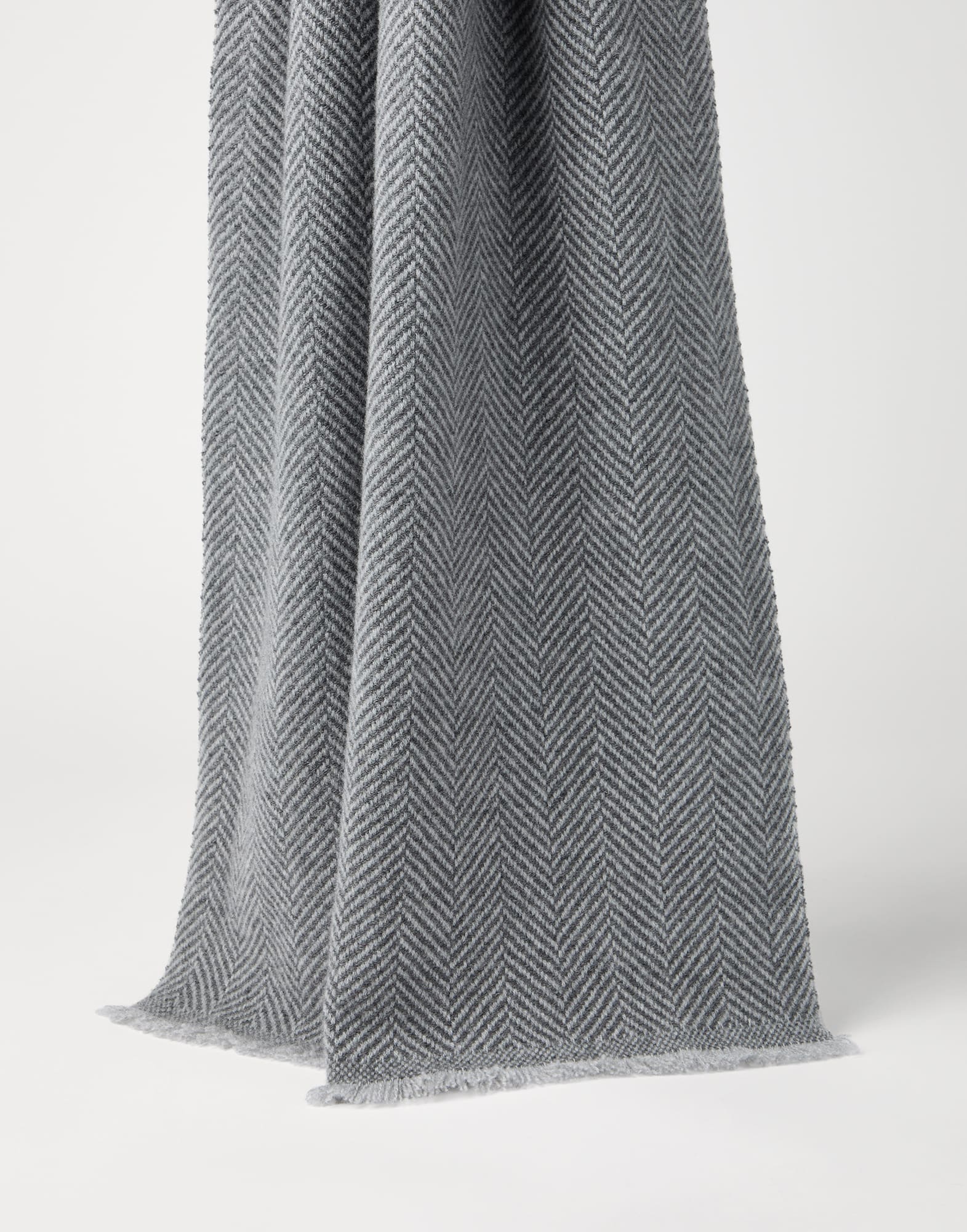 Brunello Cucinelli カシミヤの高級感で本質的なスタイルを引き立てたストール。寒さの厳しい時期に、快適さと保温力を発揮してくれるアイテムです。特有のヘリンボーン織りがアクセサリーのサルトリアル感のポイントとなっています。フリンジを縁に飾って仕上げました。